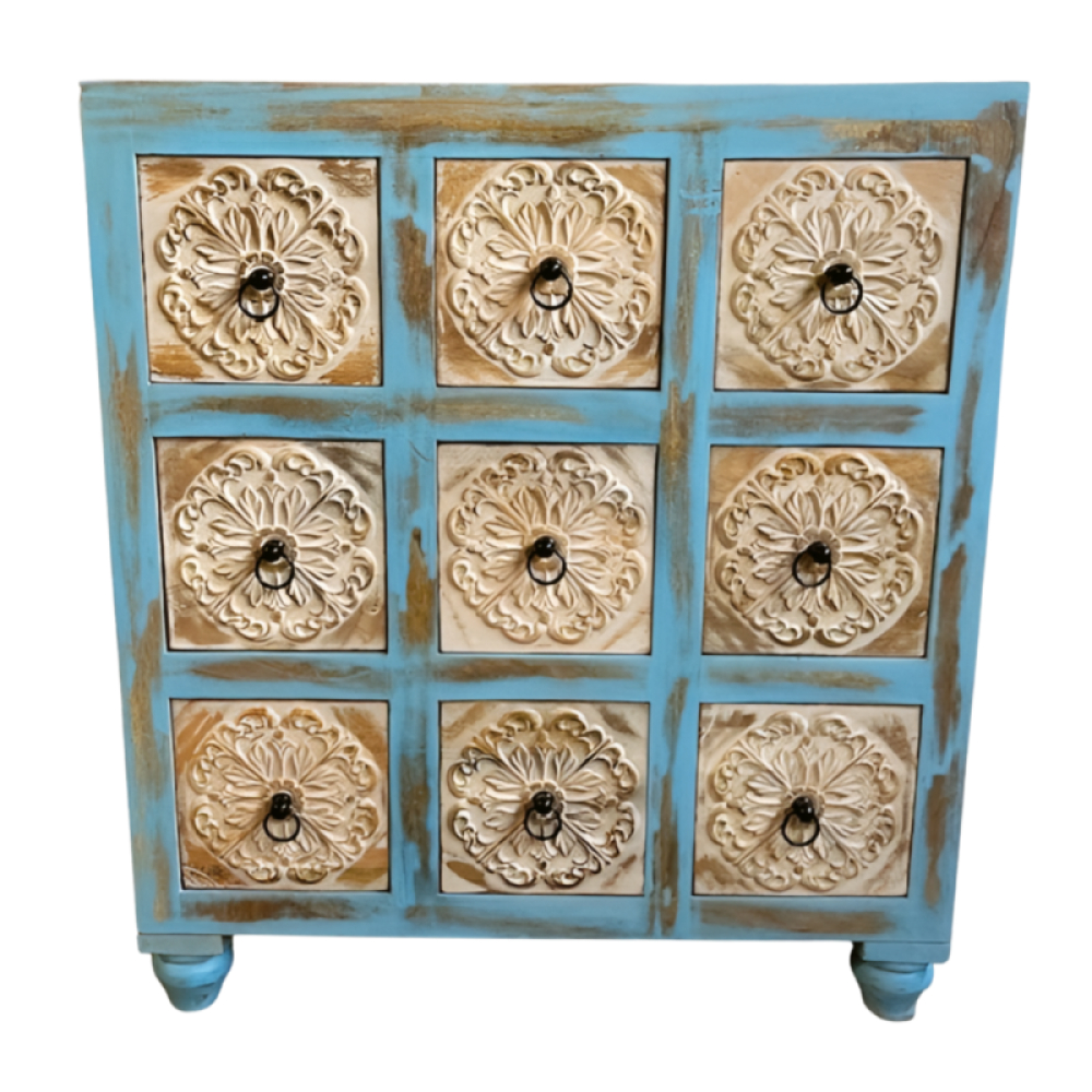 Ben je op zoek naar een meubelstuk dat direct de aandacht trekt en je interieur een vrolijke, boho-vibe geeft? De 9-Draw Cabinet Carv is vervaardigd uit massief hout en afgewerkt in een levendige hemelsblauwe kleur met een sfeervolle vintage patina. De negen laden zijn stuk voor stuk voorzien van prachtig handgesneden ronde mandala-motieven, die door de witte finish en de zwarte ringgreepjes extra geaccentueerd worden.