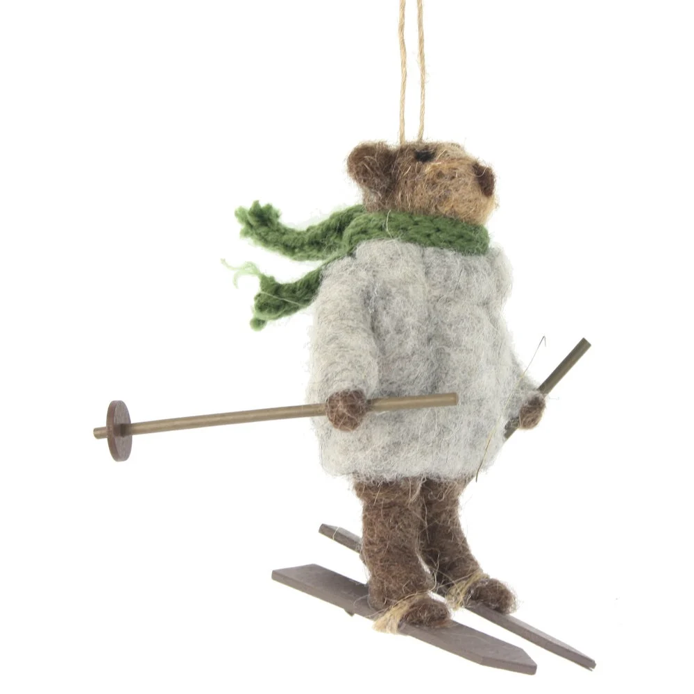 Deze charmante beer op ski's, gekleed in een stijlvolle grijze jas, brengt direct een winterse sfeer in huis. Met zijn unieke ontwerp en hoogwaardige afwerking van vilt, is dit decoratieve item een prachtige toevoeging aan je kerst- of winterdecoratie. Met afmetingen van 12x13x10 cm past hij perfect op een tafel, vensterbank of schouw.