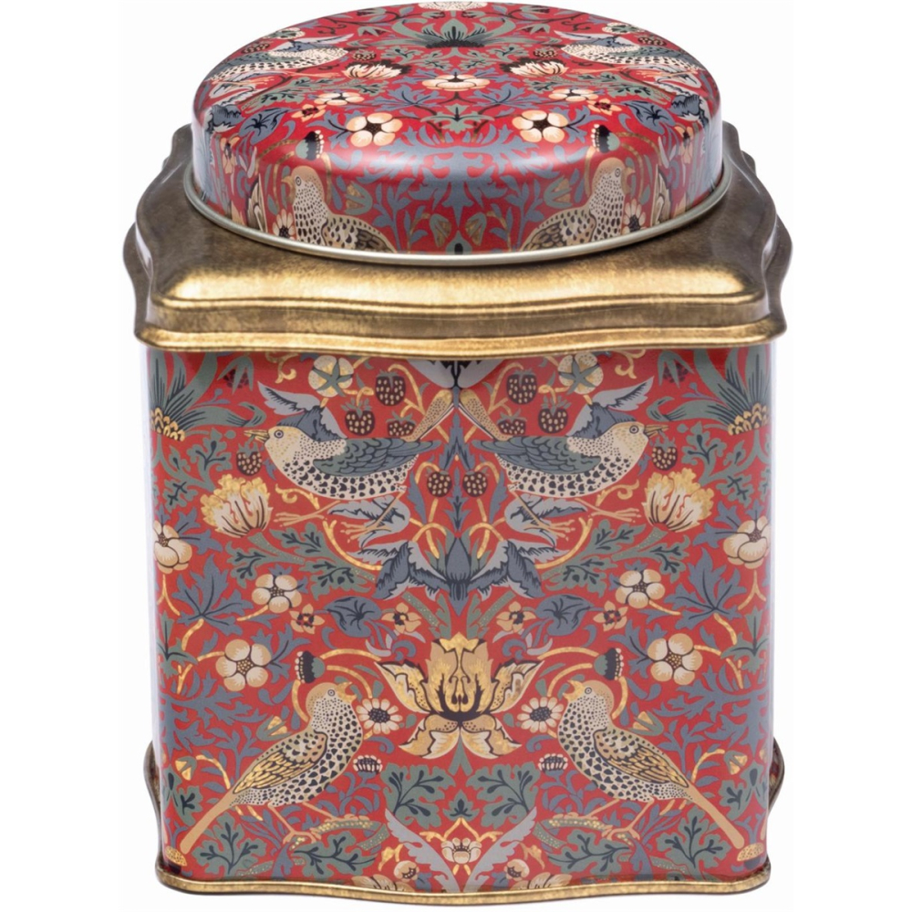 Het ontwerp toont een symmetrisch schouwspel van lijsters en aardbeien, omringd door weelderige bloemen en gestileerde bladeren. Dit iconische motief, uitgevoerd in een palet van warm rood, mosgroen en goudgele accenten, geeft het blikje een tijdloze, bijna antieke uitstraling. De afwerking met een goudkleurige, gewelfde schouder en een decoratief deksel versterkt het gevoel van vakmanschap en kwaliteit.