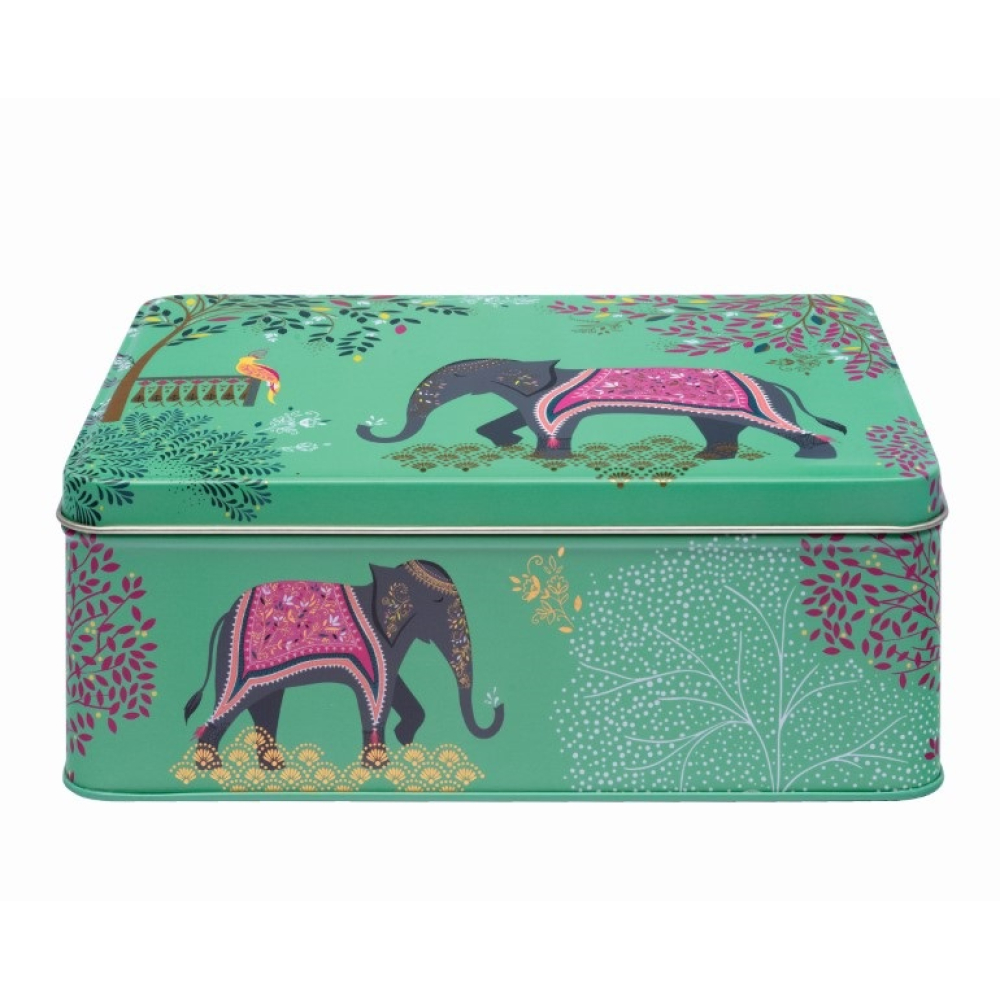 Het ontwerp toont statige olifanten die elegant over het deksel en de zijkanten wandelen. De olifanten zijn rijkelijk versierd met ceremoniële kleden in fuchsia en goud, wat prachtig contrasteert met de diepgroene achtergrond. De scène wordt omlijst door gedetailleerde botanische elementen, zoals gestileerde bomen met roze bloesems en een kleurrijke vogel die rust op een sierlijk hekwerk.