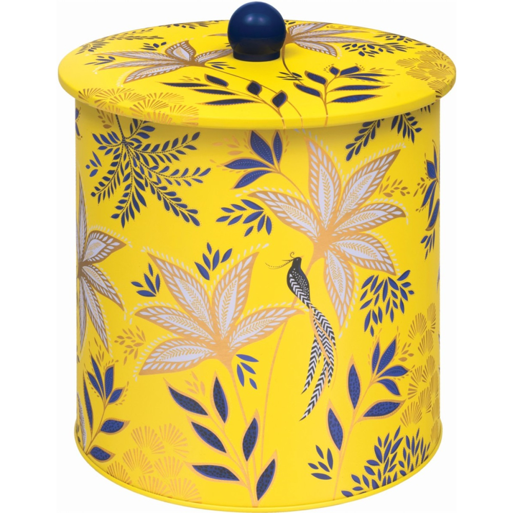 Dit opvallende ronde voorraadblik is een vrolijke en elegante toevoeging aan elk interieur. Het blik heeft een heldergele basis en is gedecoreerd met een verfijnde print van een pauw en botanische motieven in donkerblauw, wit en goud. De deksel is voorzien van een praktische, donkerblauwe knop die het blik een luxe uitstraling geeft en het openen vergemakkelijkt.
