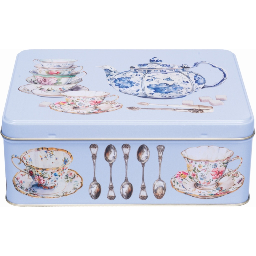 Dit ruime rechthoekige voorraadblik is een prachtige blikvanger voor de liefhebber van vintage en brocante. Het blik is uitgevoerd in een rustige lichtblauwe kleur en rijk gedecoreerd met nostalgische afbeeldingen van klassiek porseleinen servies. Op het deksel prijkt een compositie van een blauw-witte theepot, stapels fijn gedecoreerde theekopjes, suikerklontjes en antieke suikertangen.