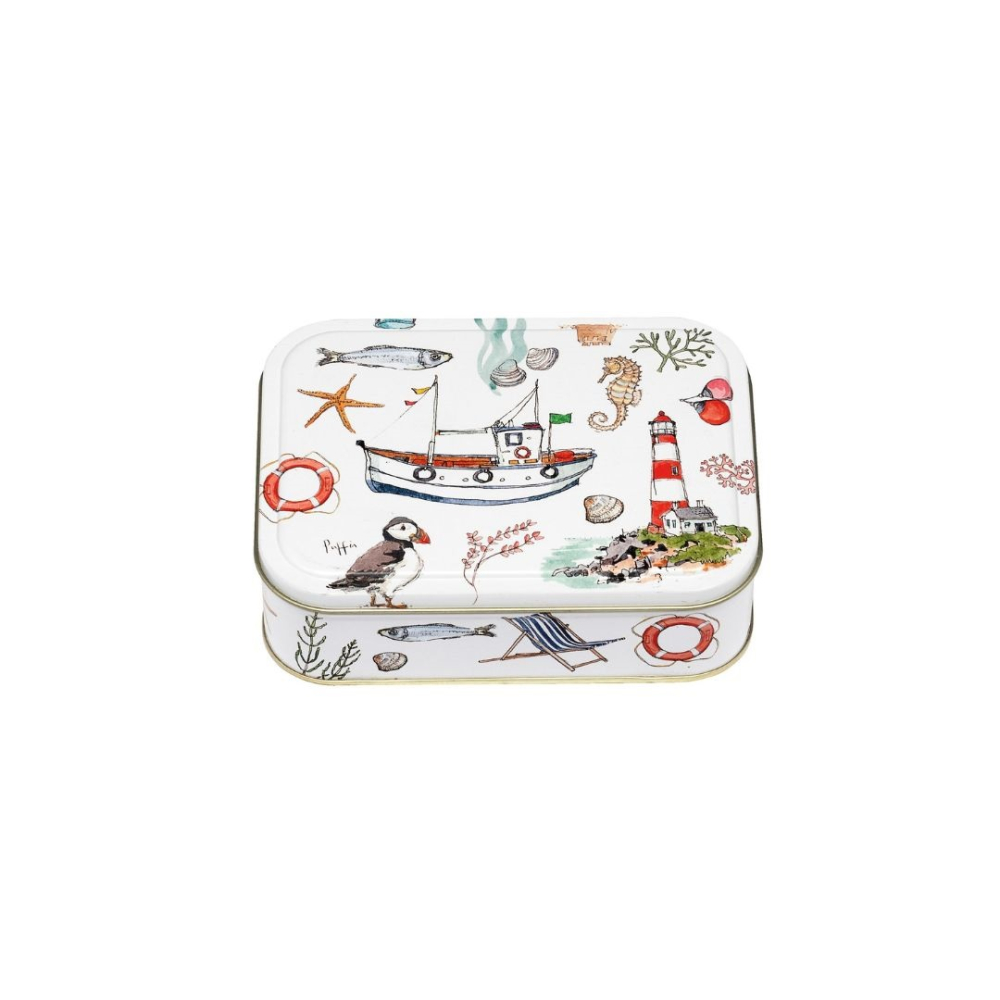 Het blikje is rondom versierd met gedetailleerde, kleurrijke illustraties in een charmante aquarel-stijl. Op de deksel en de zijkanten vind je een verzameling maritieme iconen: van een klassieke rood-witte vuurtoren en een vissersboot tot vrolijke papegaaiduikers, zeepaardjes en zeesterren. Zelfs een gestreepte strandstoel en reddingsboeien ontbreken niet aan dit zomerse tafereel.