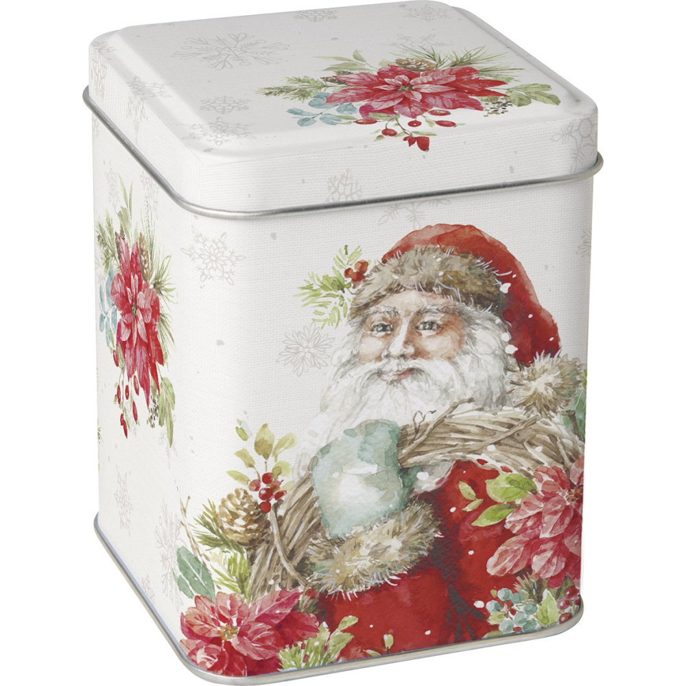 Breng de magie van de feestdagen in huis met dit feestelijke metalen bewaarblik. Het blik is prachtig geïllustreerd met een nostalgische Kerstman in aquarelstijl, omringd door rode kerststerren (Poinsettia), dennentakken en subtiele sneeuwvlokken op de achtergrond. Een sfeervolle blikvanger voor op het aanrecht of de feesttafel.