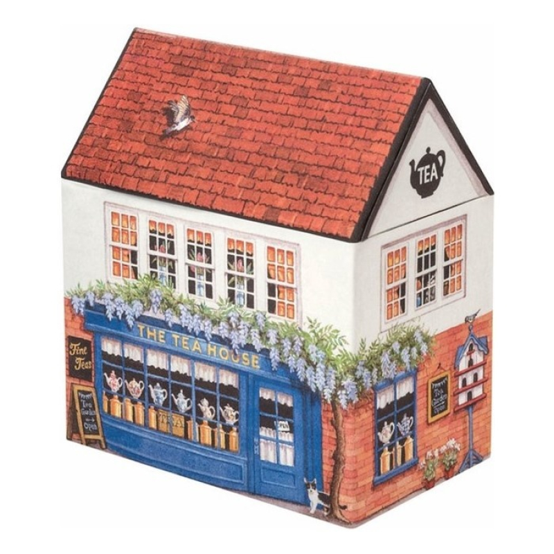 - Vintage Ontwerp: Een nostalgisch blikje met een afbeelding van een gezellig theewinkeltje, dat een charmant en huiselijk gevoel oproept.