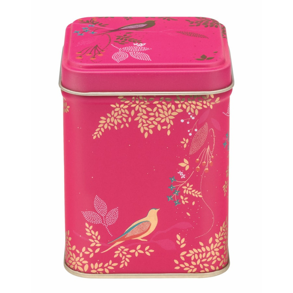 Het blikje is uitgevoerd in een diepe, levendige roze kleur en rondom versierd met elegante illustraties van vogels en bloesems. De gouden accenten in de takjes en bladeren zorgen voor een luxueuze uitstraling, terwijl de fijne details van de vogeltjes op de deksel en de zijkanten een vleugje natuur in huis brengen.