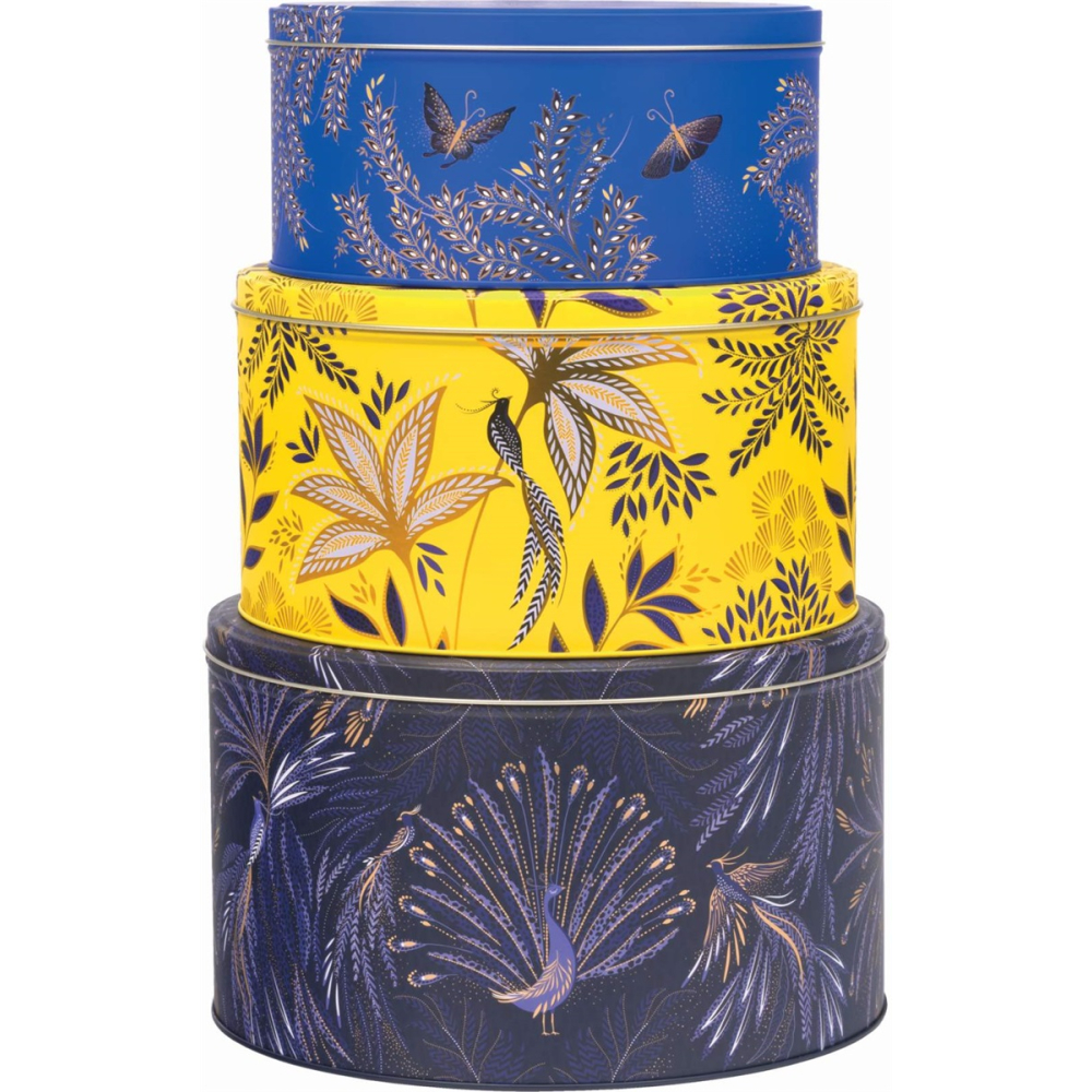 De set bestaat uit drie nestbare blikken met elk een uniek, opvallend ontwerp: