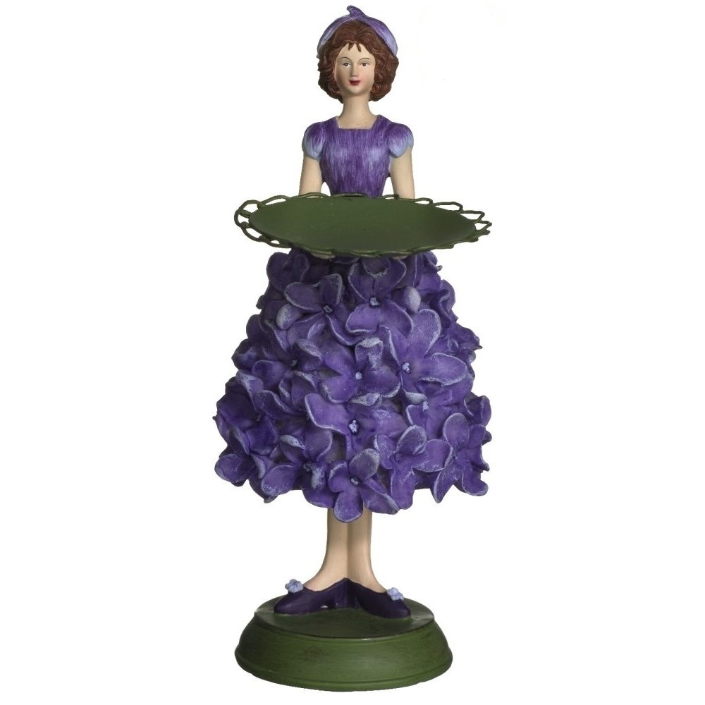 Dit prachtige decoratieve beeldje is een ode aan de natuur en de lente. Het meisje is gehuld in een schitterende jurk die volledig is opgebouwd uit paarse seringenbloesems, wat zorgt voor een dromerige en verfijnde uitstraling. In haar handen draagt ze een sierlijk groen schaaltje, waardoor dit beeldje niet alleen mooi is om naar te kijken, maar ook een praktische functie kan vervullen in huis.