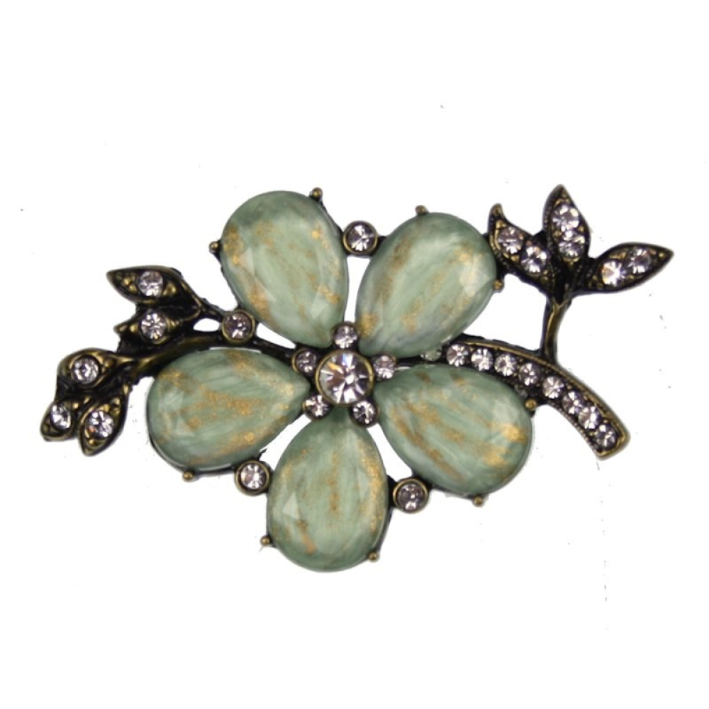 Voeg een vleugje vintage glamour toe aan je outfit met deze schitterende bloemenbroche. De broche is vormgegeven als een bloeiende tak, waarbij de blaadjes zijn ingelegd met prachtige groen-gemêleerde stenen met gouden aders. De verfijnde afwerking met fonkelende strass-steentjes zorgt voor een subtiele schittering die elke look ophaalt.