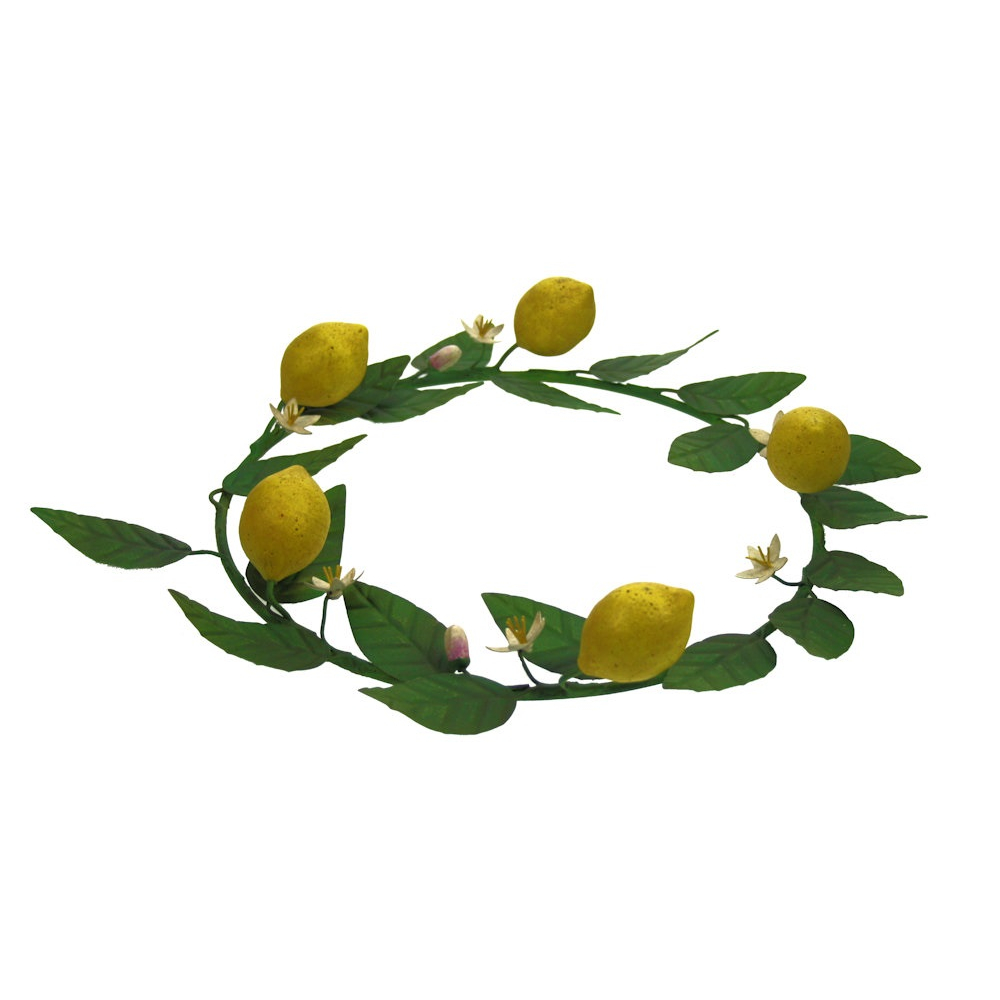 De krans is met zorg opgebouwd uit realistische citroenen in verschillende rijpingsstadia, wat zorgt voor een natuurlijk effect. De vruchten zijn ingebed in een weelderig bladerdek van stevige, donkergroene bladeren die de karakteristieke vorm van de citroenboom nabootsen. Subtiele witte bloesems met gele hartjes voegen een verfijnd en botanisch detail toe aan het geheel.