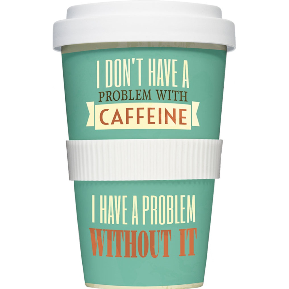 Maak een statement tijdens je ochtendwandeling of je dagelijkse rit naar het werk met deze humoristische coffee to go beker. Met de tekst "I don't have a problem with caffeine, I have a problem without it" tover je direct een glimlach op het gezicht van je collega’s en voorbijgangers. De frisse turquoise kleur en het moderne lettertype maken dit tot een hippe én praktische gadget voor iedereen die niet zonder zijn dagelijkse shot cafeïne kan.
