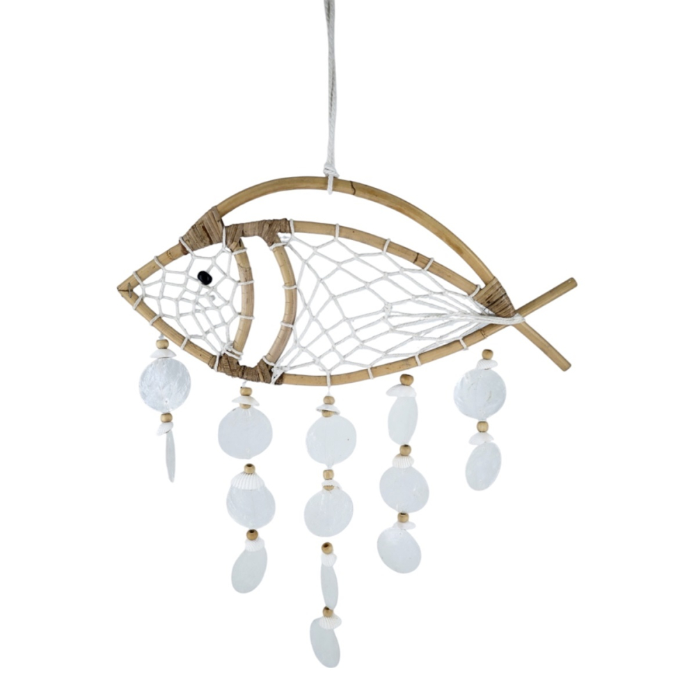 Dromenvanger Dagmar is een uniek kunstwerk voor aan de wand, met de hand vervaardigd door vakmensen in Indonesië. Het frame van de vis is gemaakt van stevig, natuurlijk bamboe en is ingespannen met een fijn wit web. De vis is versierd met strengen van doorschijnende Capiz-schelpen, houten kralen en kleine witte schelpjes die als een zachte waterval naar beneden hangen.