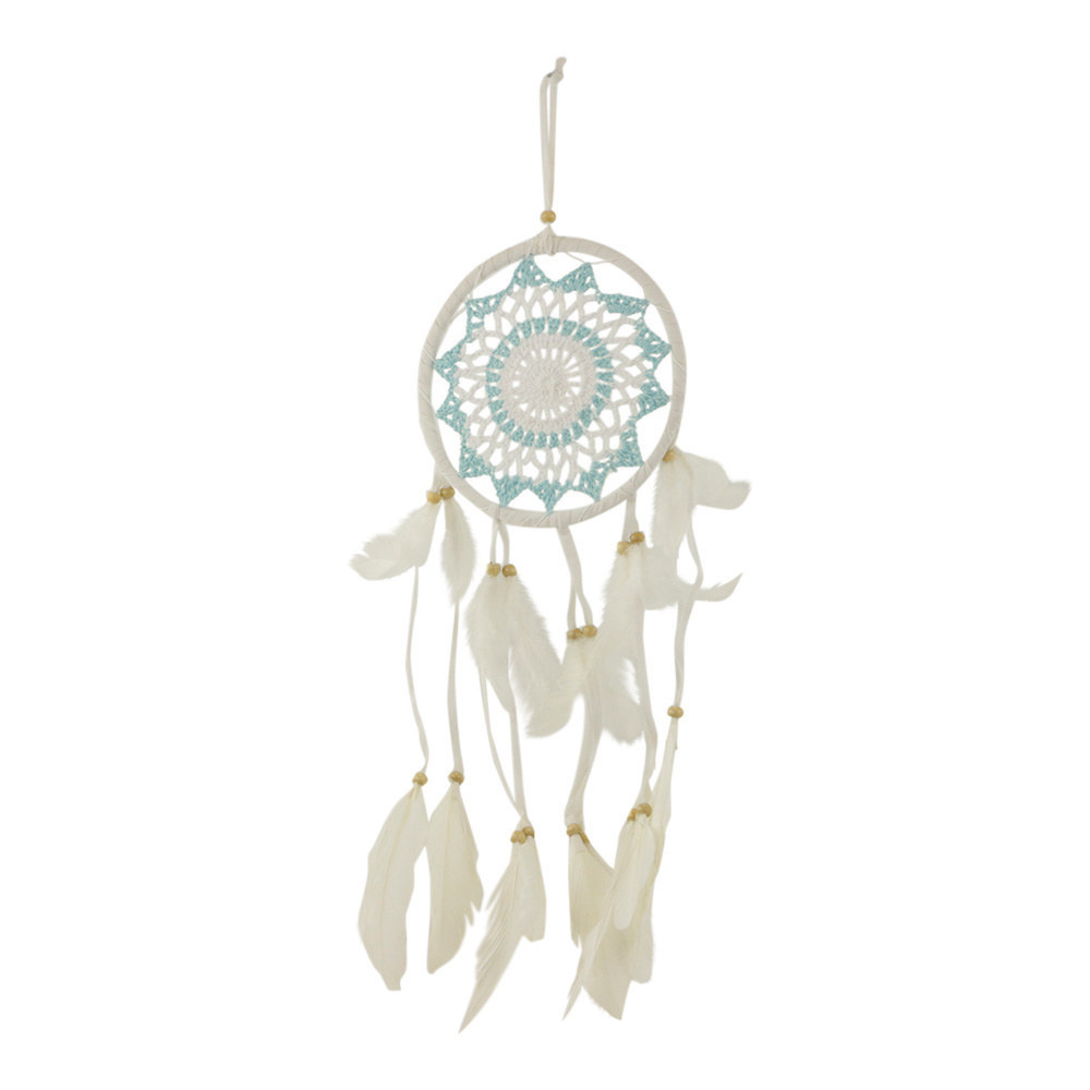 Voeg een magische en serene sfeer toe aan je interieur met de Dromenvanger wit-turquoise met veren. Deze dromenvanger van 60 x 17 x 1 cm is ontworpen met een elegante combinatie van witte en turquoise kleuren en is versierd met zachte veren die een dromerige uitstraling geven. Het katoen zorgt voor een lichte, natuurlijke afwerking. Perfect voor het ophangen in je slaapkamer of woonkamer om rust en bescherming te brengen, en een vleugje bohemian charme toe te voegen aan je interieur.