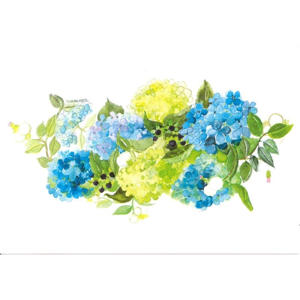 De voorzijde van de kaart toont een weelderige, horizontale compositie van hortensia's in diverse tinten helderblauw, korenbloemblauw en fris limoengroen. Het boeket is verrijkt met kleine donkere bessen en gedetailleerde groene bladeren die het geheel een levendige, natuurlijke uitstraling geven. De zachte aquareltechniek zorgt voor een luchtige presentatie tegen de helderwitte achtergrond, wat de kleuren extra laat spreken.