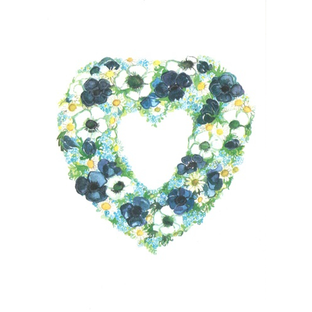 De voorzijde van de kaart toont een prachtig vormgegeven hart, opgebouwd uit een weelderige krans van bloemen. Het middelpunt van de illustratie wordt gevormd door diepblauwe en helderwitte anemonen, subtiel afgewisseld met zonnige margrieten en fijne vergeet-mij-nietjes. De zachte aquareltechniek geeft de bloemen een dromerige uitstraling, terwijl de frisgroene accenten van het bladwerk zorgen voor een levendig en natuurlijk contrast tegen de helderwitte achtergrond. De hartvorm maakt deze kaart tot een tijdloos symbool van liefde en genegenheid.