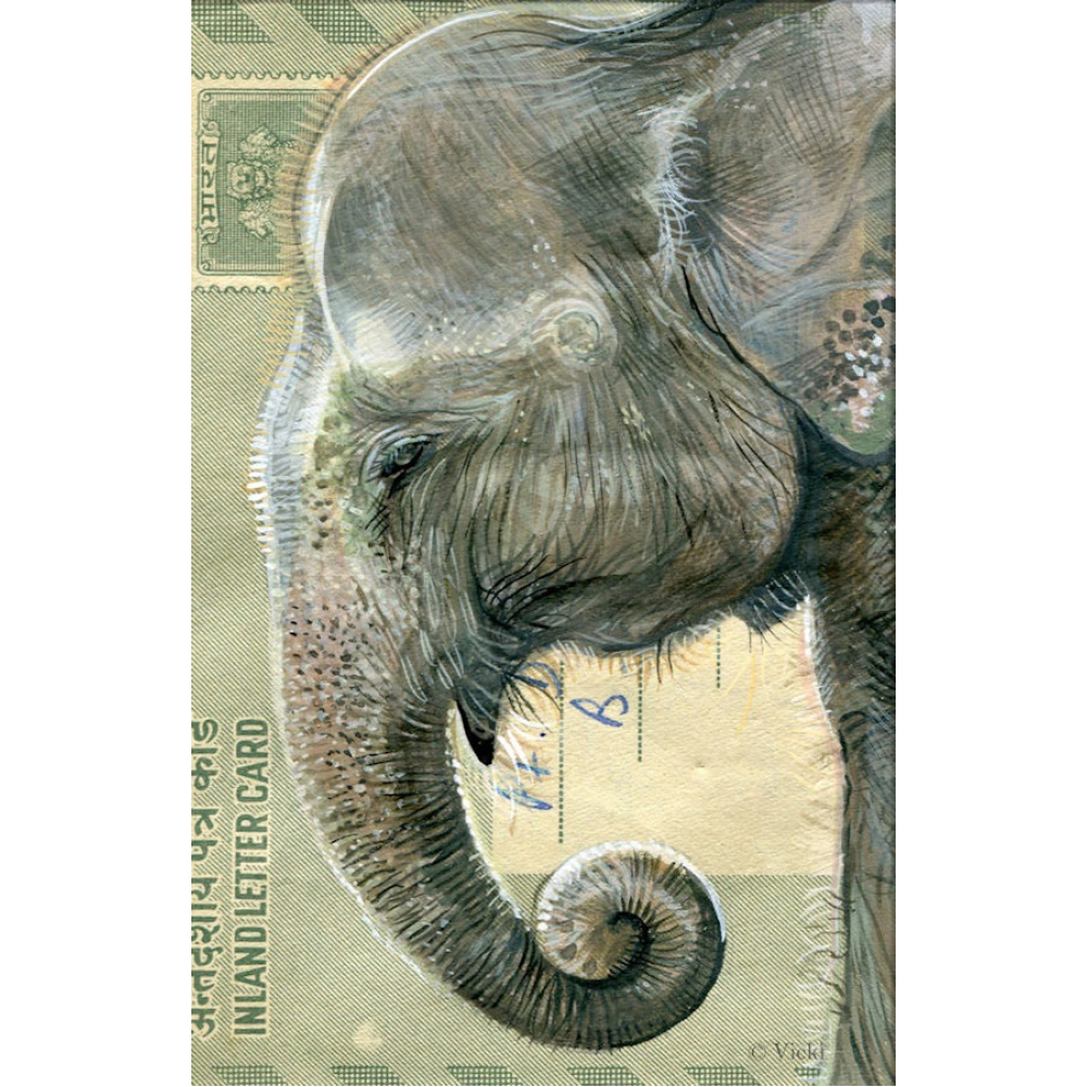Maak een groots gebaar met deze indrukwekkende wenskaart van een olifant. De gedetailleerde weergave van de huid en de karakteristieke slurf komen prachtig tot uiting tegen een vintage achtergrond van een Indiase 'Inland Letter Card'. Een artistieke kaart met een krachtige, maar rustige uitstraling, perfect voor een bijzondere mijlpaal, een felicitatie of als uniek kunstwerkje aan de muur.
