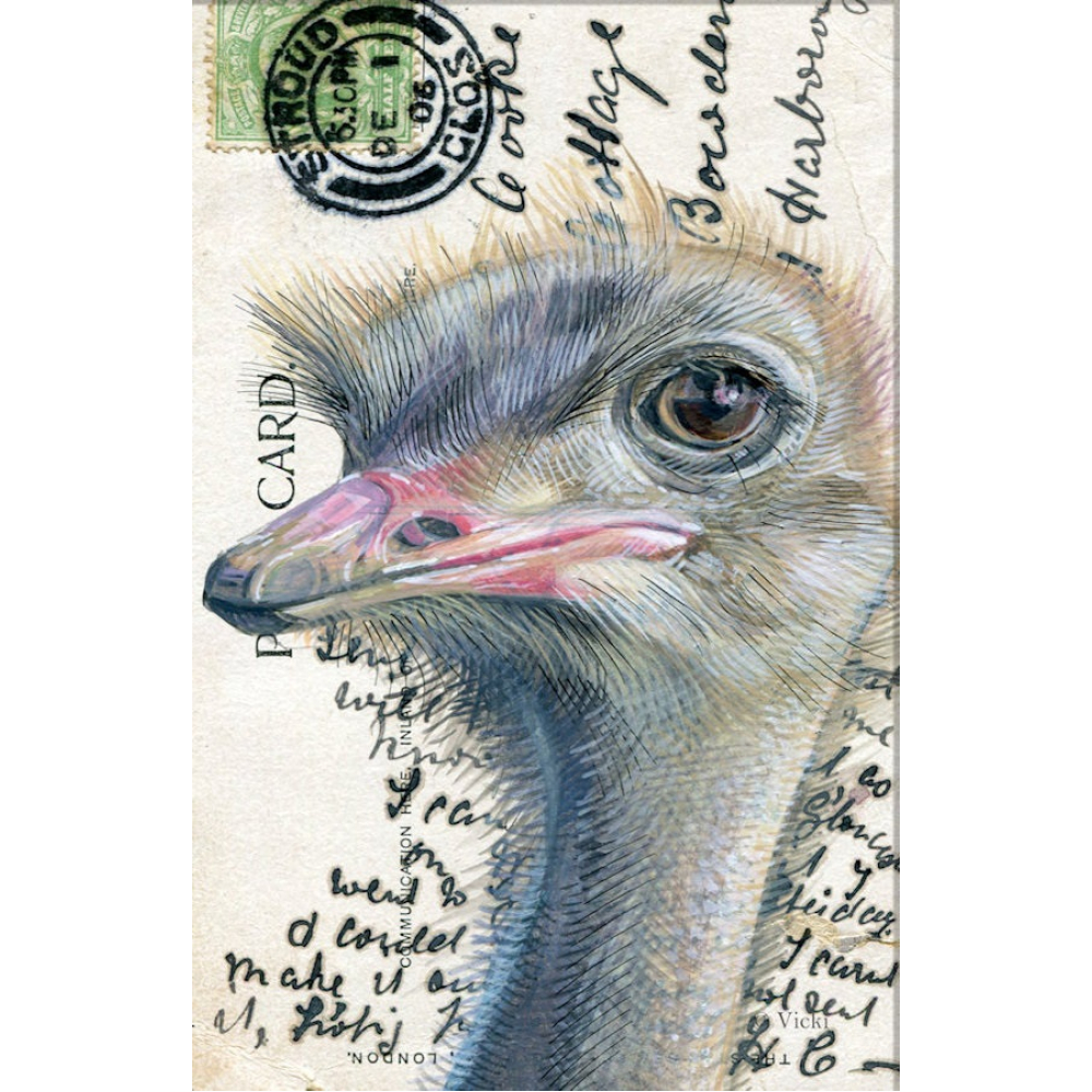 Maak een onvergetelijke indruk met deze karaktervolle wenskaart van een struisvogel. De indringende blik en de gedetailleerde veren van deze bijzondere vogel spatten van de kaart af. Dankzij de achtergrond met authentieke poststempels en een klassiek handgeschreven bericht heeft de kaart een unieke, nostalgische uitstraling. Een perfecte keuze voor iemand met humor, een reislustig type of gewoon als opvallende groet.