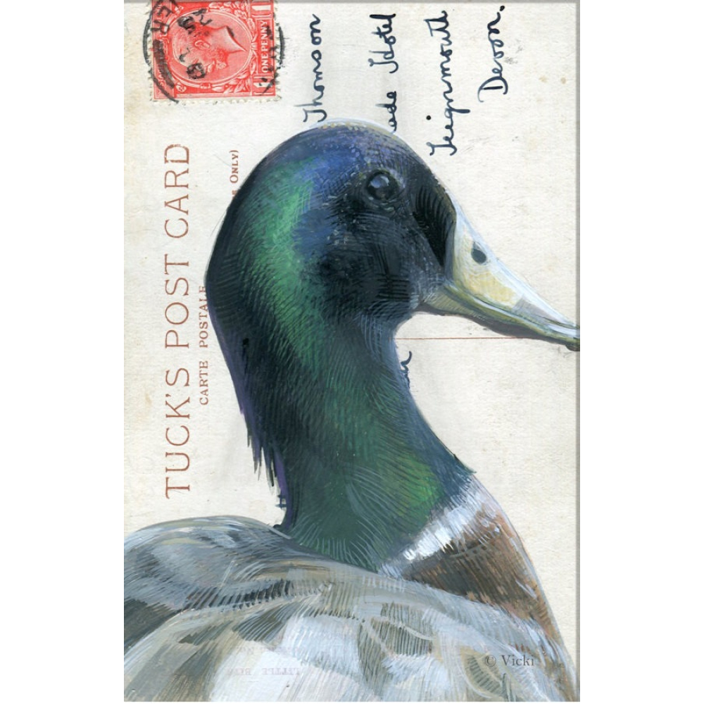 Geef je post een klassieke uitstraling met deze artistieke wenskaart van een wilde eend. De gedetailleerde illustratie, met de kenmerkende groenblauwe glans, is geplaatst tegen een nostalgische achtergrond van een antieke briefkaart met postzegel. Een sfeervolle kaart die perfect past bij een felicitatie, een bedankje of als decoratie voor liefhebbers van het buitenleven.