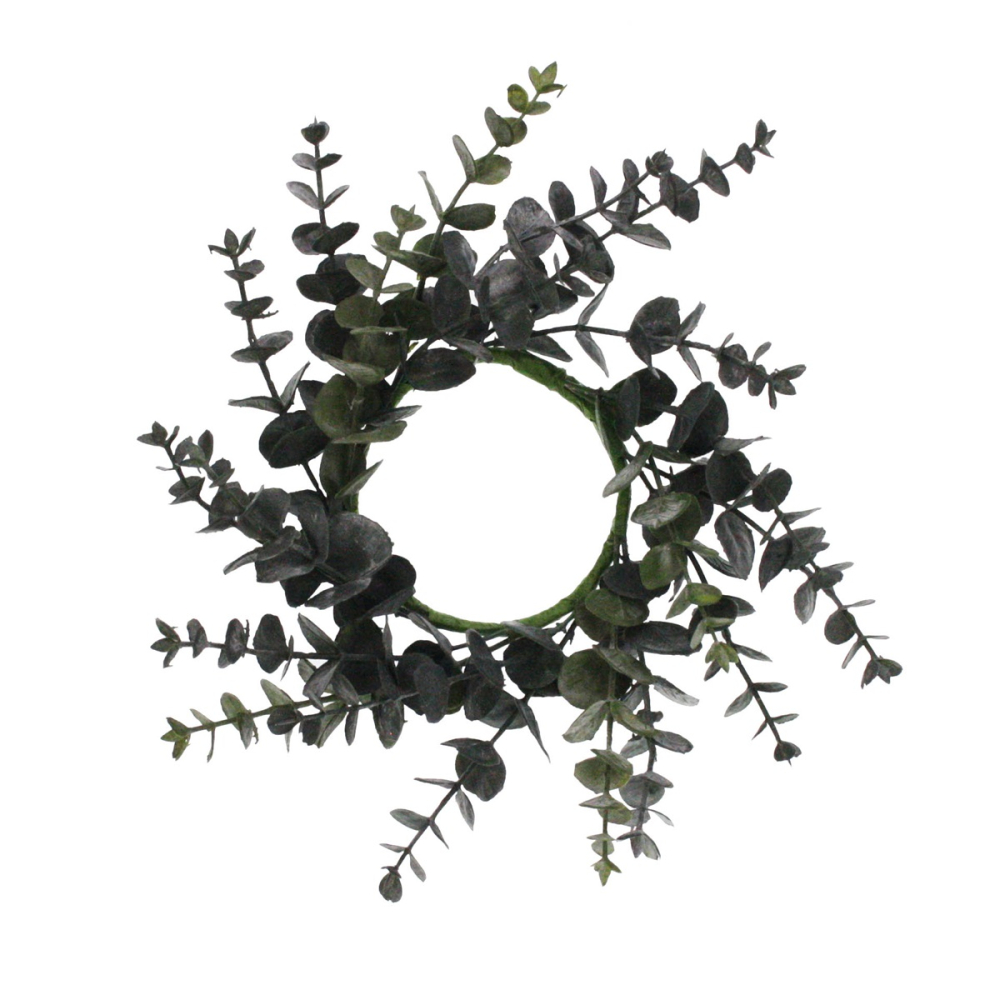 De krans is met zorg opgebouwd uit talloze takjes met karakteristieke eucalyptusbladeren in een diepe, donkergroene tint. De takjes waaieren op een natuurlijke manier uit vanaf de basis, wat zorgt voor een dynamisch en speels effect. Dankzij de hoogwaardige afwerking hebben de bladeren een realistische textuur en kleur, waardoor de krans bijna niet van echt te onderscheiden is.