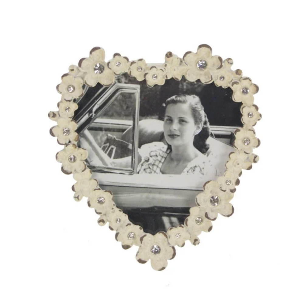 Creëer een romantische en charmante sfeer met deze prachtige Fotolijst in hartvorm. De lijst is uitgevoerd in een antiek witte kleur en versierd met delicate bloemen en sprankelende strassdetails, wat zorgt voor een elegante uitstraling. Het perfecte accessoire om je favoriete foto in te lijsten en een bijzondere plek in je interieur te geven. Ideaal voor romantische of klassieke woonstijlen.