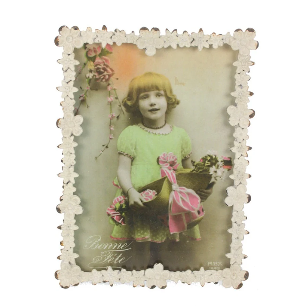Vereeuwig je kostbare herinneringen in stijl met dit prachtige fotolijstje "Bloemen" in antiek wit. Een elegante en tijdloze manier om je favoriete foto's te presenteren en je interieur te verrijken.