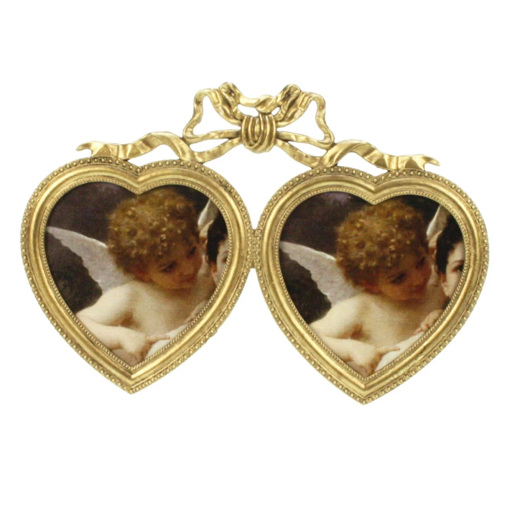 Dit dubbele fotolijstje met hartvormig ontwerp in antiek goudkleur is een elegante en romantische manier om je favoriete herinneringen te bewaren. Het lijstje heeft twee vakken van 9x9 cm, ideaal voor het tonen van twee foto's of afbeeldingen. De vintage afwerking maakt het een perfecte toevoeging aan een romantische of klassieke interieurstijl.