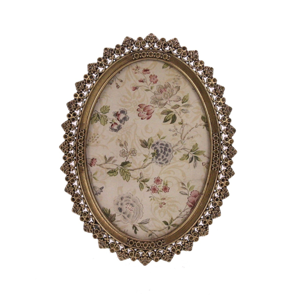 Breng een vleugje barokke elegantie in je interieur met dit prachtige ovale fotolijstje. De antiek goudkleurige finish en de ragfijne, opengewerkte rand geven het lijstje een authentieke uitstraling, alsof het rechtstreeks uit een statig landhuis komt. Het is een tijdloos decoratiestuk dat moeiteloos sfeer en karakter toevoegt aan je woonkamer, hal of slaapkamer.