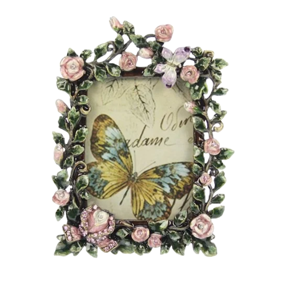 Dit prachtige fotolijstje van RH met emaille roosjes is een stijlvolle toevoeging aan je interieur. De sierlijke rozenversiering geeft het lijstje een romantische, vintage uitstraling. Geschikt voor foto's van 6x8,5 cm, met een totale afmeting van 9x12 cm. Ideaal als decoratie of als cadeau voor een geliefde.