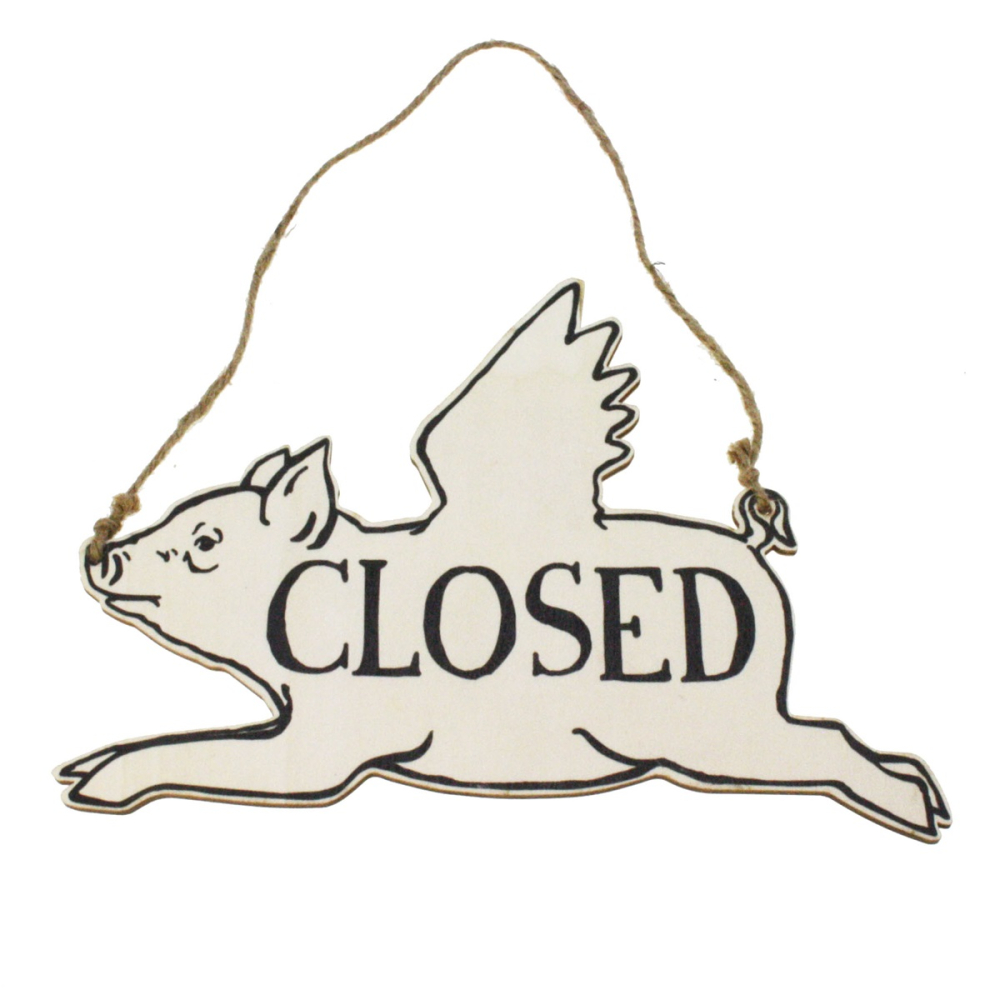 Dit dubbelzijdige houten bordje is niet alleen praktisch, maar tovert ook direct een glimlach op het gezicht van je voorbijgangers en klanten. Het bordje is uitgevoerd in de vorm van een vrolijk vliegend varken en is voorzien van een handig jute touw om het gemakkelijk op te hangen aan een deur of in een raamopening.