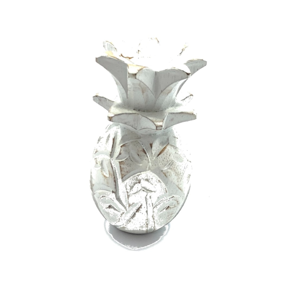 Houd je van een tropische touch, maar geef je de voorkeur aan een rustig kleurenpalet? Deze witte houten ananas is met de hand gesneden op Bali en afgewerkt met een subtiele whitewash-finish. Deze afwerking benadrukt het ambachtelijke snijwerk van de schubben en bladeren, terwijl de natuurlijke warmte van het hout hier en daar zachtjes doorschemert voor een authentieke, doorleefde look.