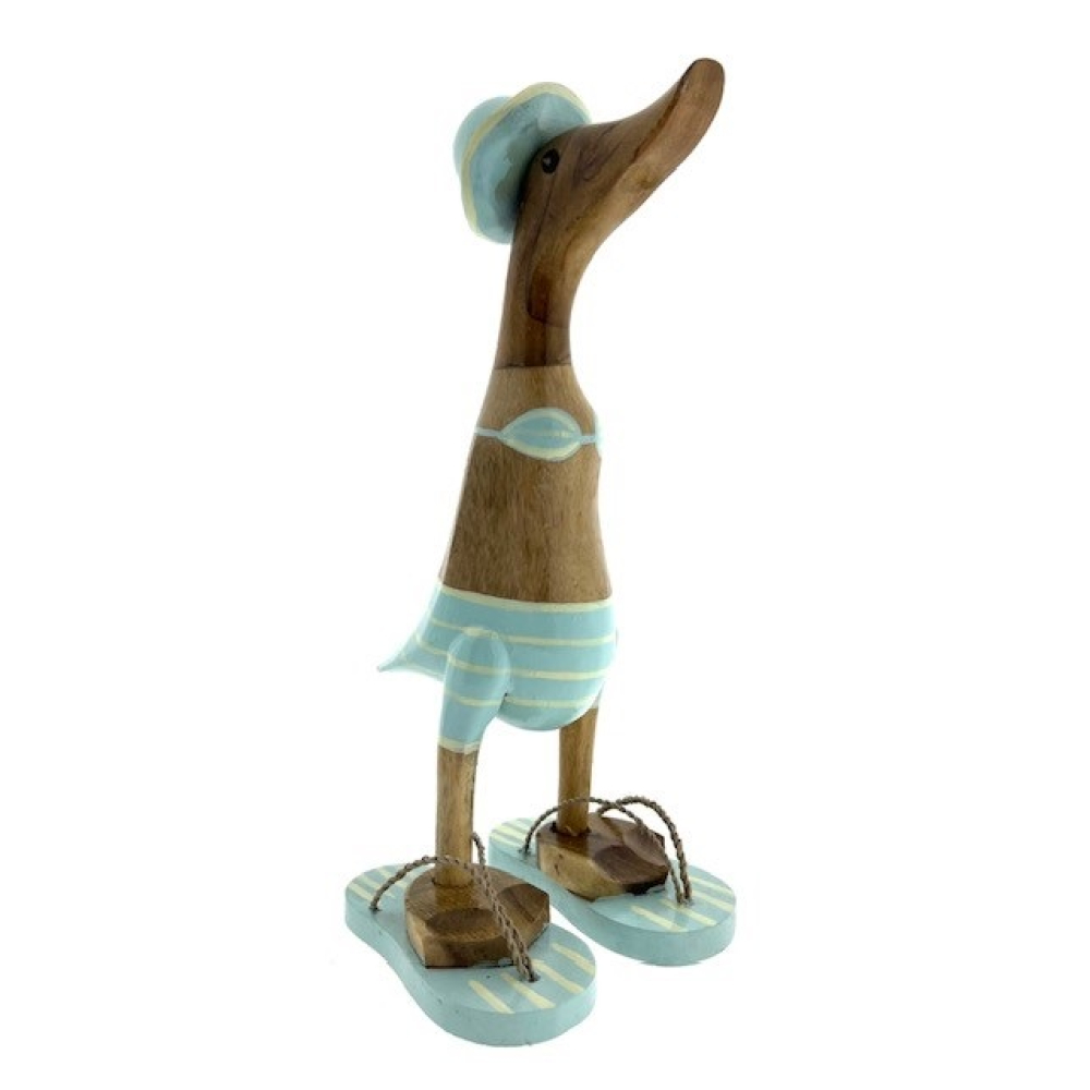 Eend Stana is volledig klaar voor een zonovergoten dag aan de kust. Ze is stijlvol gehuld in een lichtblauw gestreepte bikini en draagt een bijpassend hoedje. De details maken het echt af: ze staat op een paar grote, handgemaakte slippers met authentieke touwdetails. Met een hoogte van maar liefst 41 cm is dit "Large" model perfect geschikt om als solitair object op de vloer te staan, naast een grote plant, of als centraal decoratiestuk in een lichte woonkamer.