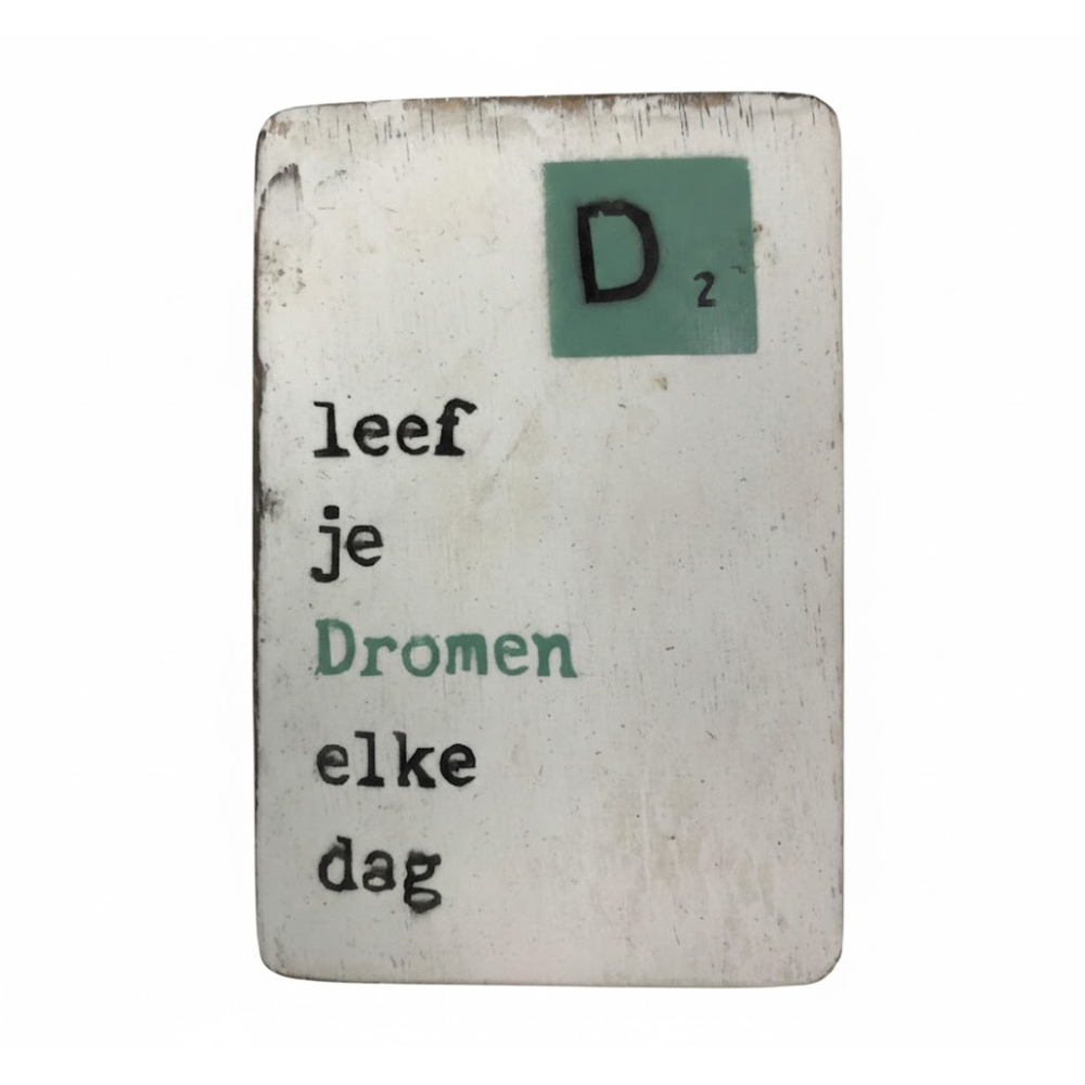 Dromen zijn er om nagejaagd te worden, en soms hebben we even een klein duwtje in de rug nodig om dat niet te vergeten. Deze stijlvolle houten magneet met de tekst "Leef je Dromen elke dag" herinnert je eraan om elke dag het beste uit jezelf en je leven te halen. Een perfect cadeau voor iemand die een nieuwe weg inslaat, of gewoon als motivatie voor jezelf.