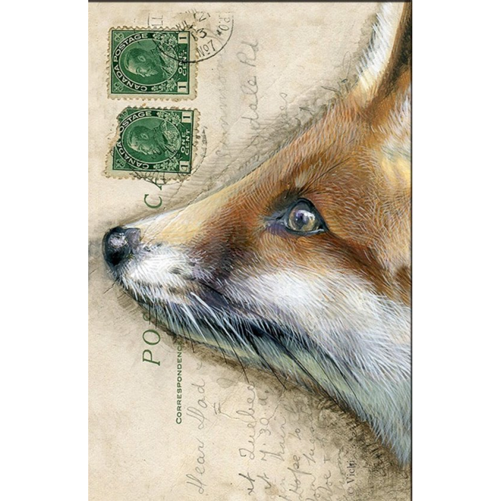 Breng de mystiek van het bos in je post met deze sfeervolle wenskaart van een rode vos. De gedetailleerde illustratie legt de alerte en slimme blik van de vos perfect vast. De achtergrond, verfraaid met authentieke Canadese postzegels en een handgeschreven vintage bericht, maakt van deze kaart een uniek en artistiek gebaar. Een ideale keuze voor natuurliefhebbers, avonturiers of als stoere felicitatie.