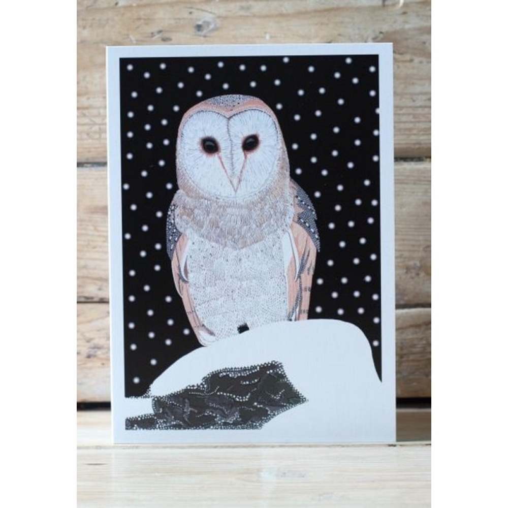 Breng een magische wintergroet met deze artistieke wenskaart van een kerkuil. De illustratie combineert zachte wit- en bruintinten met een krachtig contrast van een donkere nachtelijke hemel vol sneeuwvlokken. De fijnzinnige stiptechniek en het strakke kleurgebruik geven de kaart een moderne en serene uitstraling. Een prachtige keuze voor de feestdagen, een winterse verjaardag of als sfeervolle decoratie in huis.