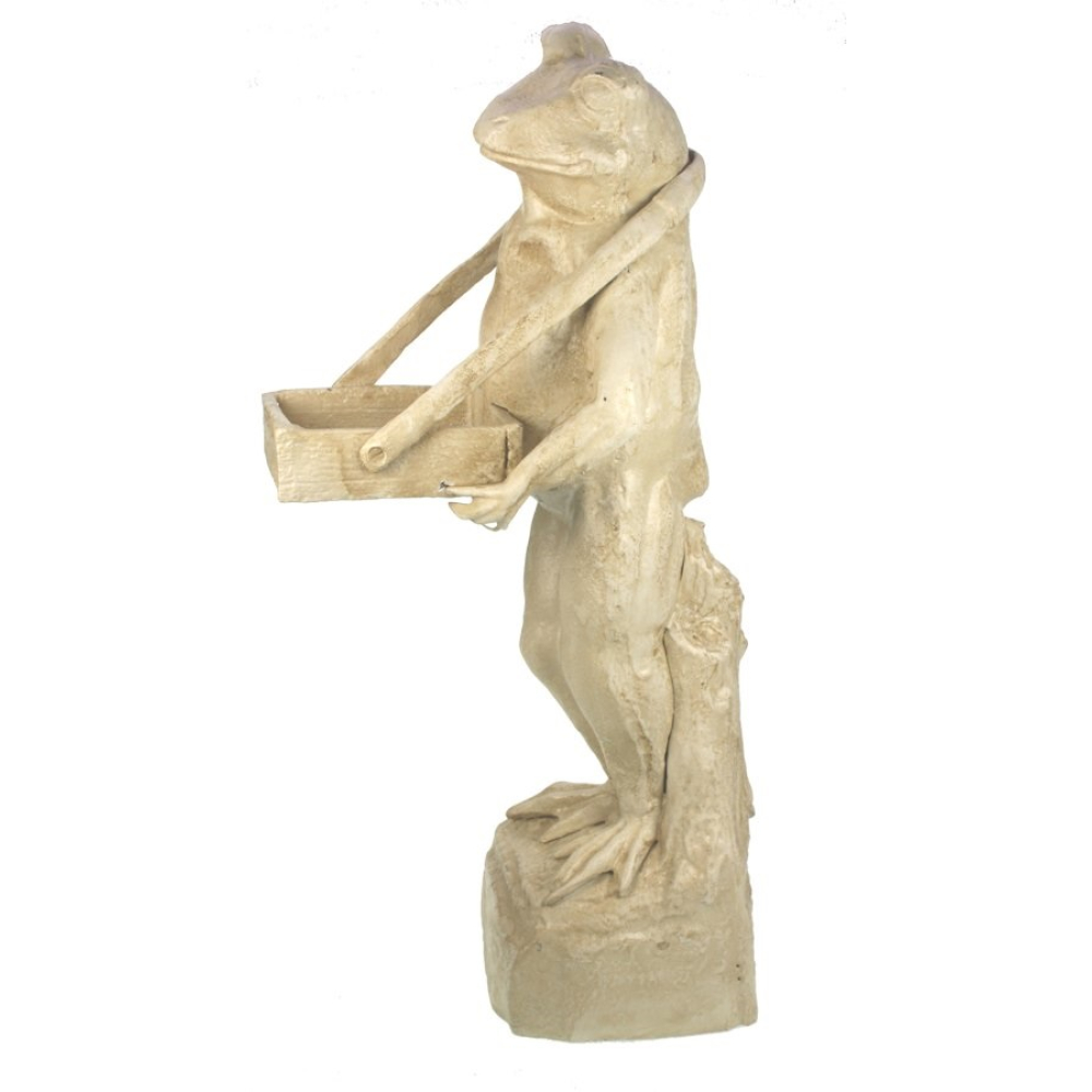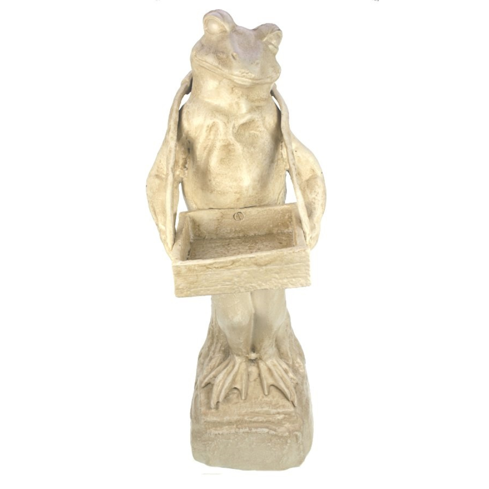 Dit grote decoratieve beeld van een staande kikker is een ware blikvanger. Met een hoogte van maar liefst 55 cm is hij niet over het hoofd te zien. De kikker is afgebeeld in een dienende pose, waarbij hij met beide handen een houten of stenen bakje voor zich draagt. De verfijnde, antiek-witte afwerking geeft het beeld een tijdloze uitstraling die prachtig verweert in de buitenlucht.