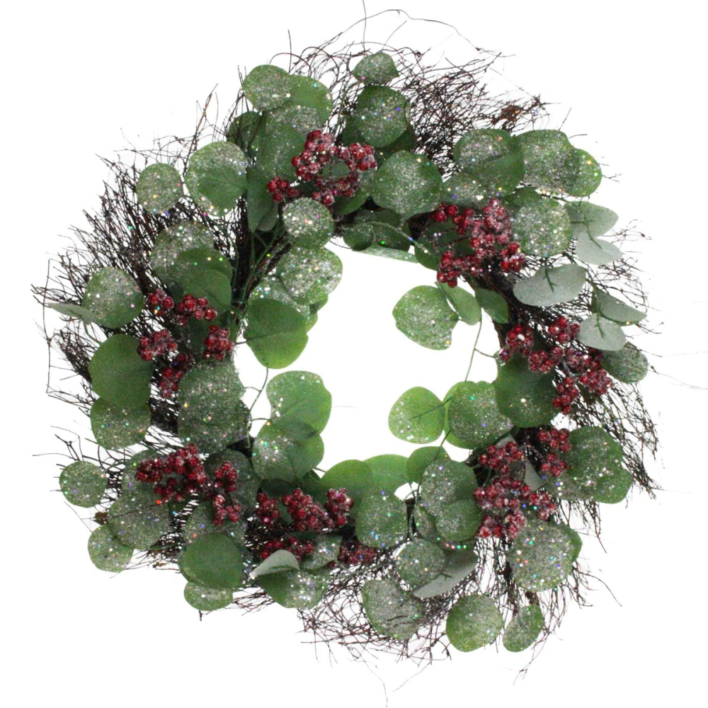 Deze krans is met zorg samengesteld op een natuurlijke, donkere takkenbasis, wat zorgt voor een rustieke en authentieke uitstraling. De ronde eucalyptusbladeren zijn voorzien van een fijne glitterfinish die prachtig sprankelt in het kaarslicht of bij de kerstboom. De trossen met rode bessen geven een levendig kleuraccent en maken het winterse plaatje compleet.