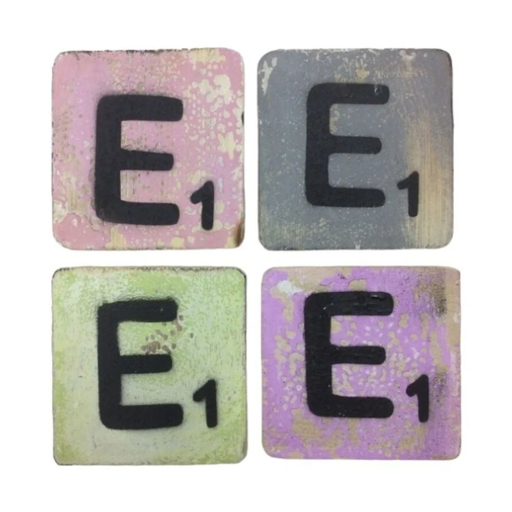Handgemaakte houten scrabble letter E in verschillende kleuren.