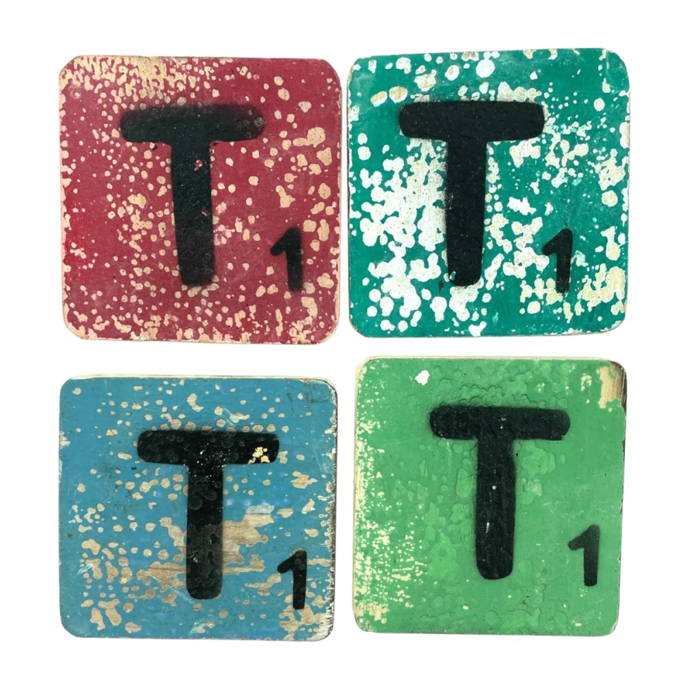 Handgemaakte houten scrabble letter T in verschillende kleuren.