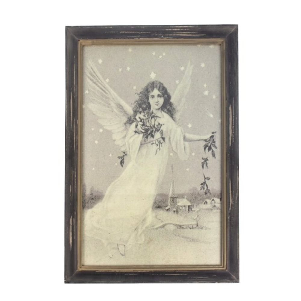 De afbeelding is uitgevoerd in een klassieke, fijnzinnige illustratiestijl die doet denken aan antieke gravures en prenten uit vervlogen tijden. Een sierlijke engel zweeft door een sterrennacht boven een besneeuwd dorpje, terwijl zij takken met hulstbladeren en bessen met zich meedraagt. De subtiele grijstinten en het zachte lijnenspel creëren een dromerige en serene atmosfeer. Het werk is gevat in een robuuste zwarte houten lijst met een verfijnde gouden binnenrand, die de illustratie een luxe en hoogwaardige uitstraling geeft. De licht verweerde afwerking van de lijst voegt een authentieke vintage touch toe aan het geheel.