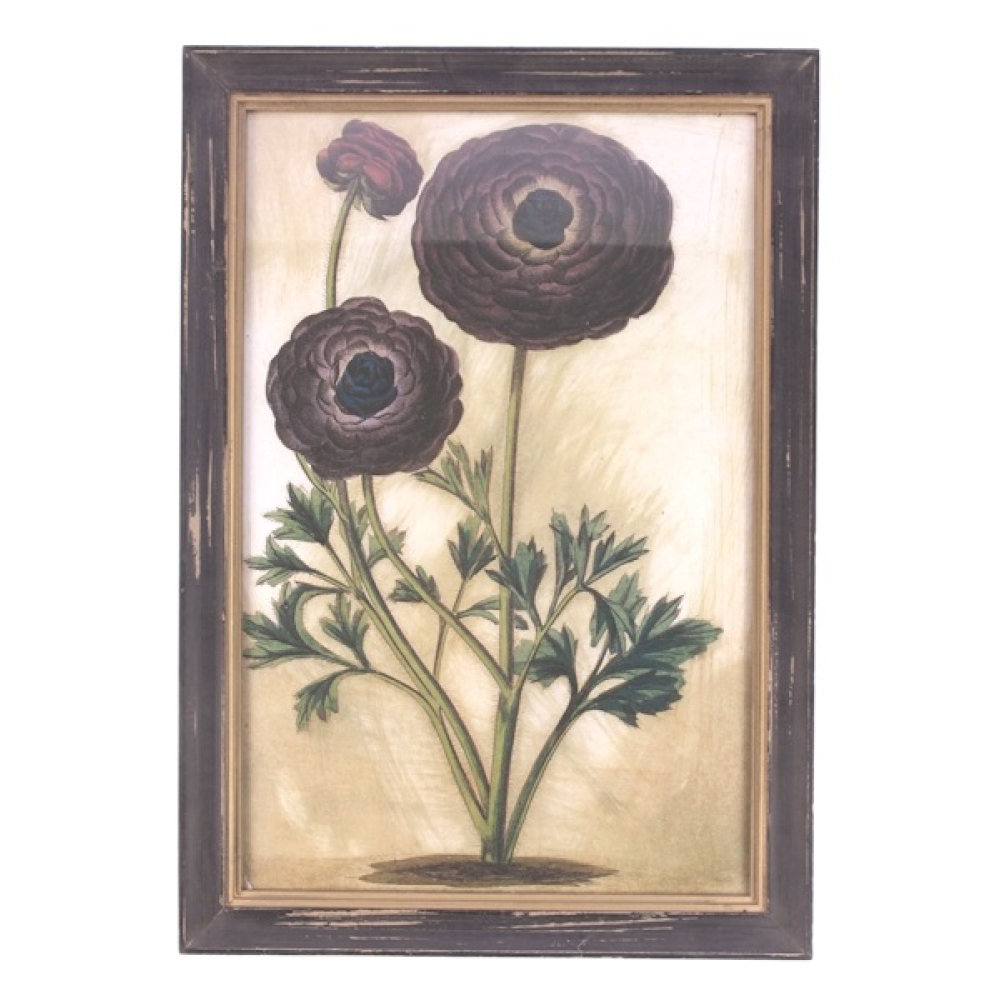 De afbeelding toont drie ranonkels in verschillende stadia van bloei, uitgevoerd in een diepe, bijna zwart-paarse tint. De rijke gelaagdheid van de bloemen steekt scherp af tegen de lichte, textuurrijke achtergrond, wat een prachtig chiaroscuro-effect creëert. De fijn gesneden groene bladeren aan de basis van de stelen geven het werk een natuurlijke levendigheid. Het werk is gevat in een robuuste zwarte houten lijst met een verfijnde gouden binnenrand, die de botanische print een luxe uitstraling geeft. De licht verweerde afwerking van de lijst voegt een authentieke vintage touch toe aan het geheel.
