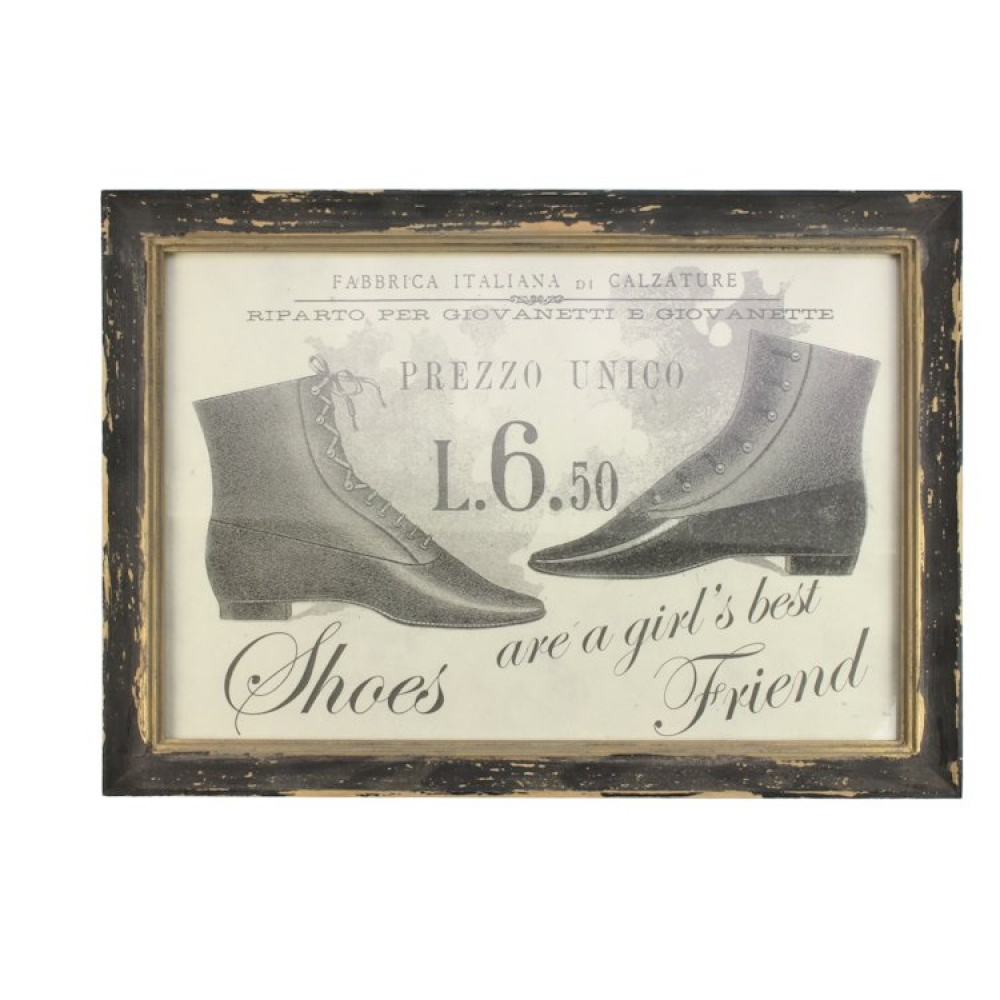 De afbeelding toont een prachtig gedetailleerde illustratie van twee verschillende modellen klassieke veterlaarsjes, uitgevoerd in een authentieke zwart-wit stijl. De prent ademt de sfeer van antieke Italiaanse modeadvertenties, compleet met teksten als "Fabbrica Italiana di Calzature" en de charmante Engelse quote "Shoes are a girl's best friend". Het werk is gevat in een robuuste zwarte houten lijst met een verfijnde gouden binnenrand, wat de illustratie een luxe en hoogwaardige uitstraling geeft. De licht verweerde afwerking van de lijst voegt een authentieke vintage touch toe aan het geheel.