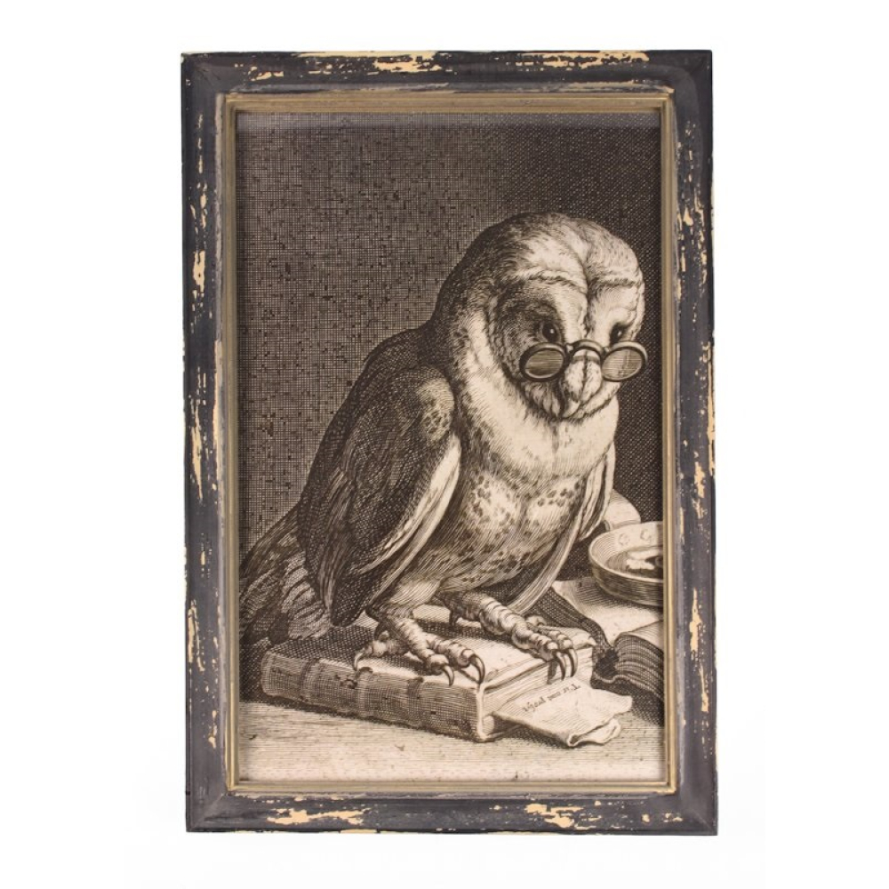 De afbeelding is uitgevoerd in een gedetailleerde zwart-wit stijl die doet denken aan 17e-eeuwse kopergravures. Een wijze uil, compleet met een ouderwetse bril op zijn snavel, is gezeten bovenop een antiek boek. De fijne arcering en het contrastrijke lijnenspel geven de uil een bijna tastbare textuur en een diepe, doordringende blik. Het werk is gevat in een robuuste zwarte houten lijst met een verfijnde gouden binnenrand, wat de prent een museale en hoogwaardige uitstraling geeft. De licht verweerde afwerking van de lijst voegt een authentiek vintage karakter toe aan het geheel.