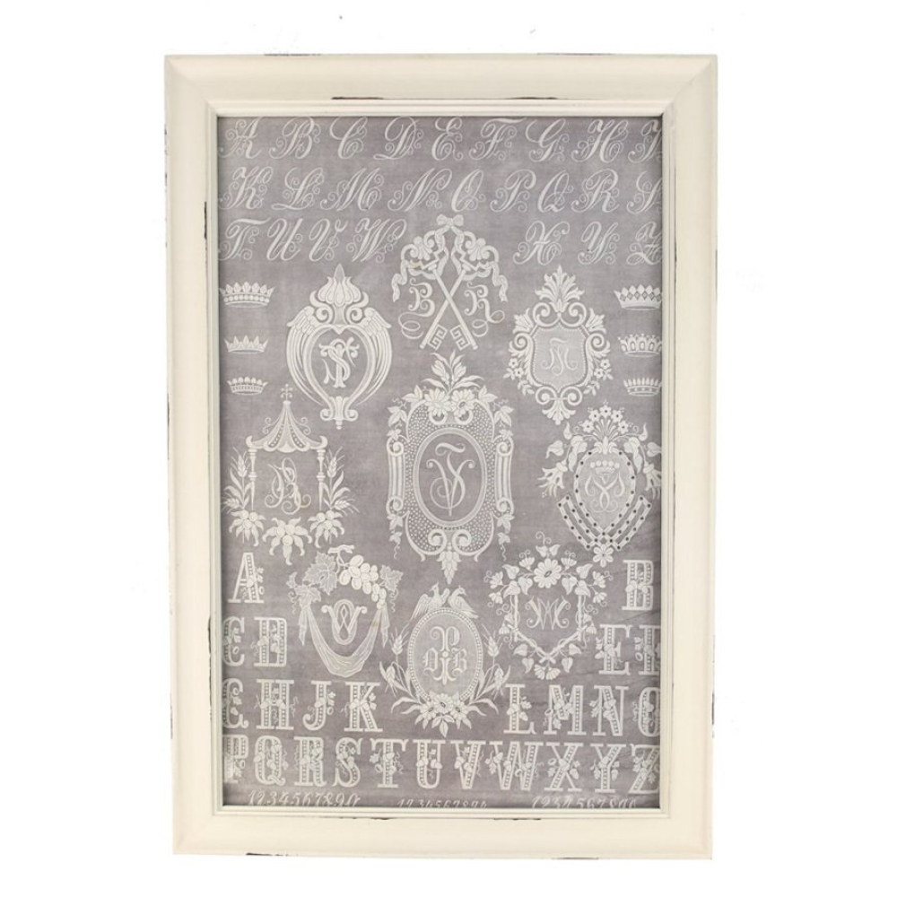 De afbeelding toont een prachtige verzameling van verschillende alfabetten en rijk gedecoreerde monogrammen, uitgevoerd in een fijnzinnige witte stijl tegen een zachte grijze achtergrond. De prent doet denken aan antieke borduurpatronen of linnenstempels uit de 19e eeuw, compleet met kroontjes, bloemmotieven en sierlijke krullen. Het werk is gevat in een strakke witte houten lijst, die door een licht verweerde afwerking een subtiele vintage touch krijgt.