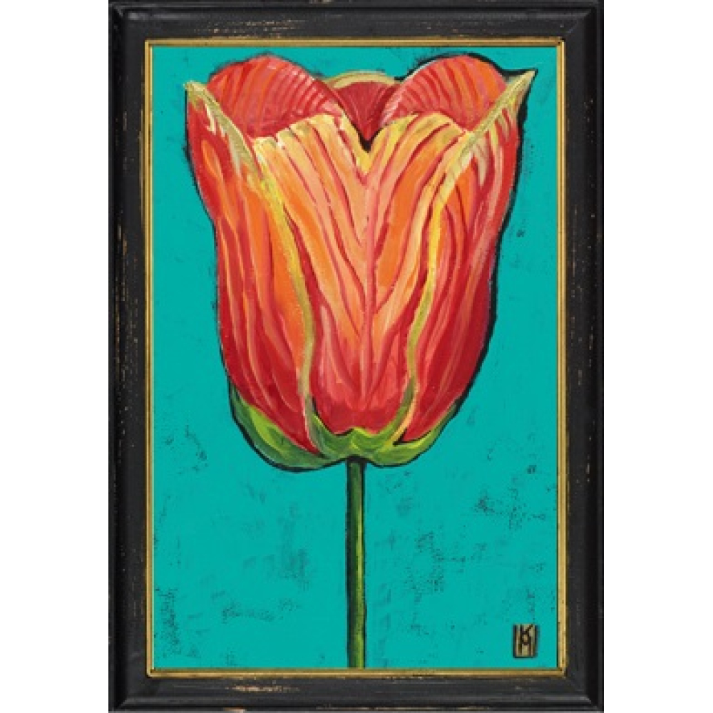 De afbeelding van de geelrode tulp is uitgevoerd in een expressieve, gelaagde schilderstijl. De warme schakeringen van rood, oranje en geel op de bloembladen vormen een vurig contrast met de heldere, turquoise achtergrond. De fijne gouden accenten langs de randen van de tulp geven het werk een extra dimensie en een luxueuze glans. Het werk is gevat in een robuuste zwarte houten lijst met een verfijnde gouden binnenrand, die de botanische print een hoogwaardige uitstraling geeft. De licht verweerde afwerking van de lijst voegt een authentieke vintage touch toe aan het geheel.