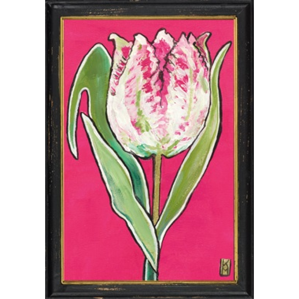 De afbeelding van de roze papegaai tulp is uitgevoerd in een expressieve, gelaagde schilderstijl. Het levendige samenspel van fuchsia, zachtroze en witte nuances op de bloembladen steekt gedurfd af tegen de intens roze achtergrond. De krachtige groene bladeren aan de steel zorgen voor een natuurlijke balans in deze opvallende compositie. Het werk is gevat in een robuuste zwarte houten lijst met een verfijnde gouden binnenrand, die de botanische print een luxe uitstraling geeft. De licht verweerde afwerking van de lijst voegt een authentieke vintage touch toe aan het geheel.