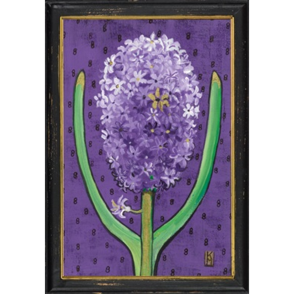 De afbeelding van de paarse hyacint is uitgevoerd in een expressieve, gelaagde schilderstijl. De rijke paars- en lila tinten van de bloem vormen een prachtig geheel met de dieppaarse achtergrond, die is voorzien van een verfijnd grafisch patroon. De twee groene bladeren die de bloem omarmen zijn subtiel afgewerkt met gouden details aan de toppen. Het werk is gevat in een robuuste zwarte houten lijst met een verfijnde gouden binnenrand, die de botanische print een luxe uitstraling geeft. De licht verweerde afwerking van de lijst voegt een authentieke vintage touch toe aan het geheel.