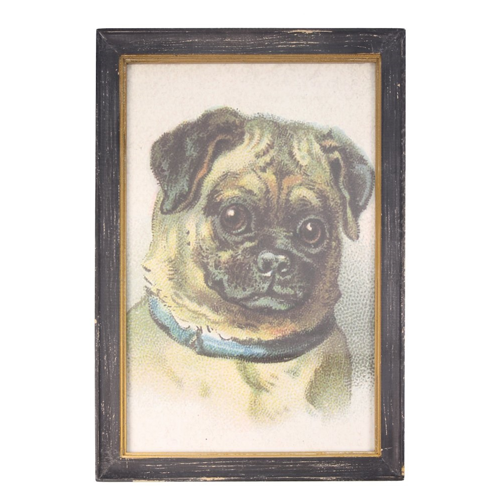 De afbeelding toont een aandoenlijk portret van een mops, gekenmerkt door de typische rimpels en grote, trouwe ogen. De hond draagt een subtiele blauwe halsband die een verfijnd kleuraccent geeft aan het geheel. De illustratie is uitgevoerd in een zachte, korrelige pointillisme-achtige stijl, wat de print een authentiek antiek en doorleefd karakter geeft. Het werk is gevat in een robuuste zwarte houten lijst met een verfijnde gouden binnenrand, wat het portret een luxe en museale uitstraling geeft. De licht verweerde afwerking van de lijst versterkt het gevoel van een bijzondere vintage vondst.