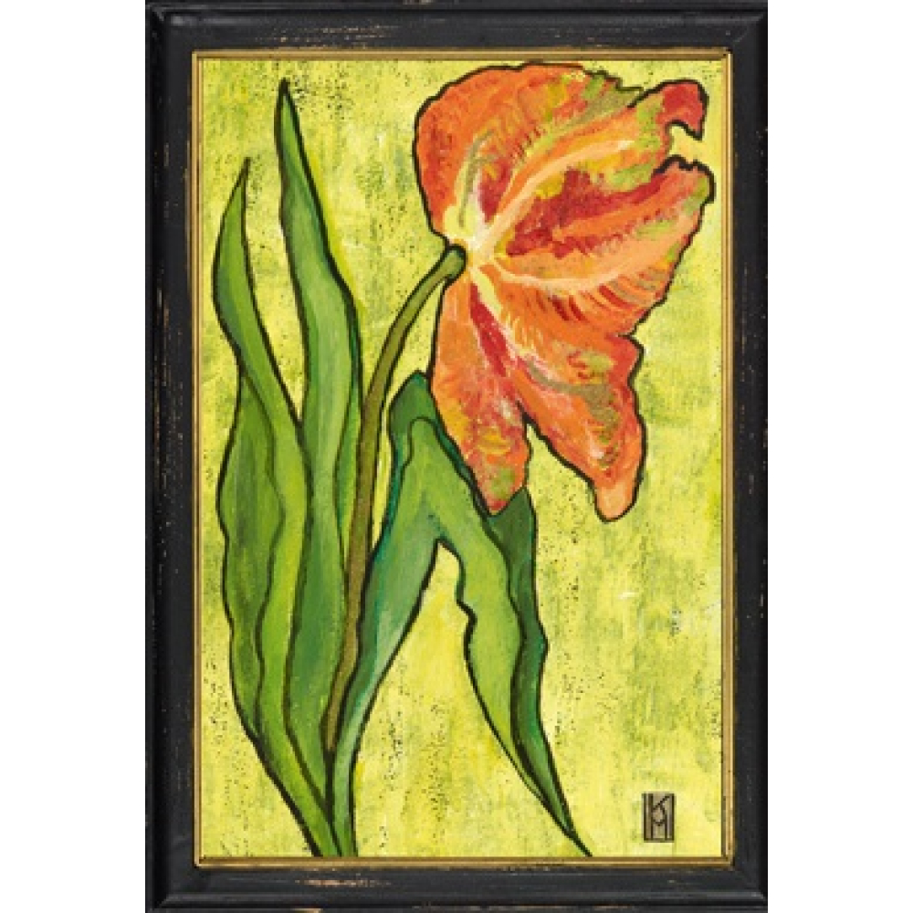 De afbeelding van de oranje papegaai tulp is uitgevoerd in een expressieve, gelaagde schilderstijl. De diepe oranje- en koraaltinten van de bloem, verfijnd met subtiele goud- en groenaccenten, vormen een prachtig en warm geheel. De tulp steekt levendig af tegen de lichtgroene, textuurrijke achtergrond. De sierlijke, golvende bladeren aan de steel versterken het dynamische karakter van deze bijzondere bloemsoort. Het werk is gevat in een robuuste zwarte houten lijst met een verfijnde gouden binnenrand, die de botanische print een luxe uitstraling geeft. De licht verweerde afwerking van de lijst voegt een authentieke vintage touch toe aan het geheel.