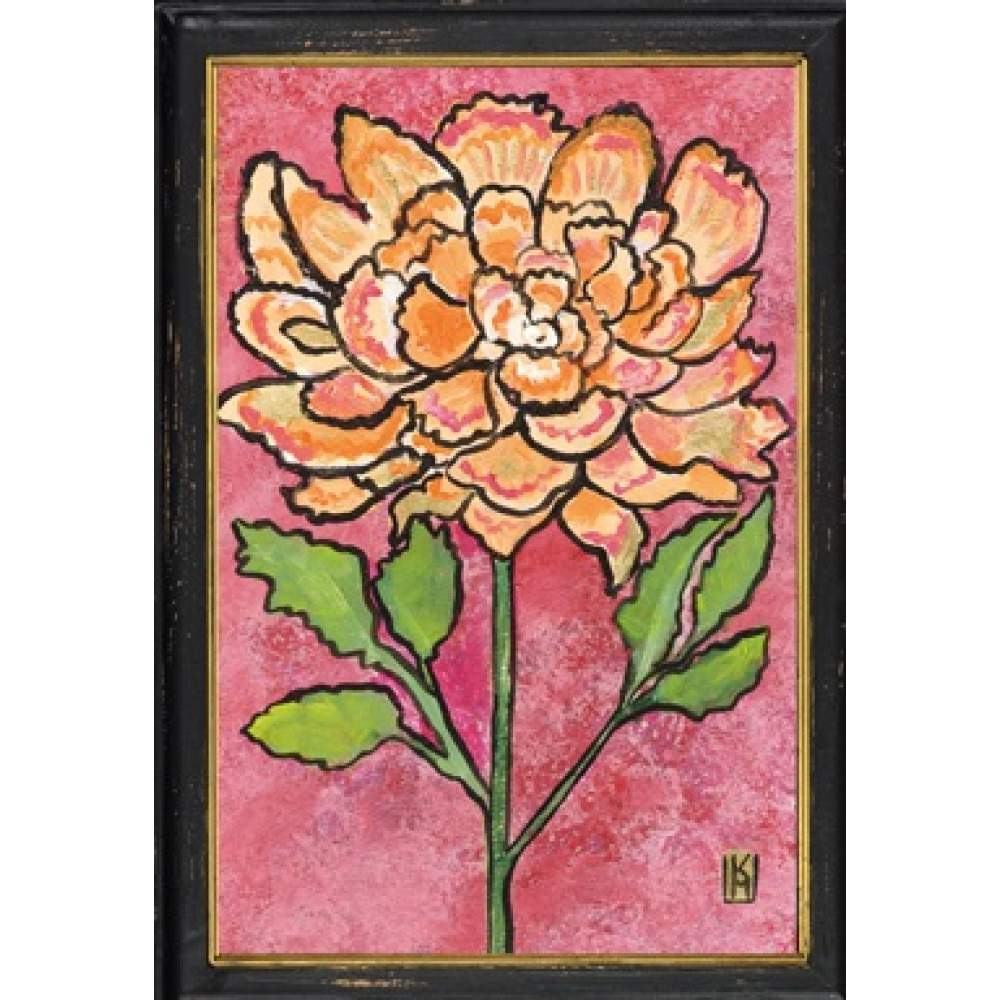 Geef je wand of dressoir een kleurrijke boost met dit ingelijste kunstwerkje. De pioenroos, bekend om haar volle bladeren en symboliek van liefde en geluk, is hier afgebeeld in warme oranje- en geeltinten tegen een levendige, gespikkelde roze achtergrond. De zwarte houten lijst met gouden binnenrand omlijst het geheel op een klassieke en krachtige manier.