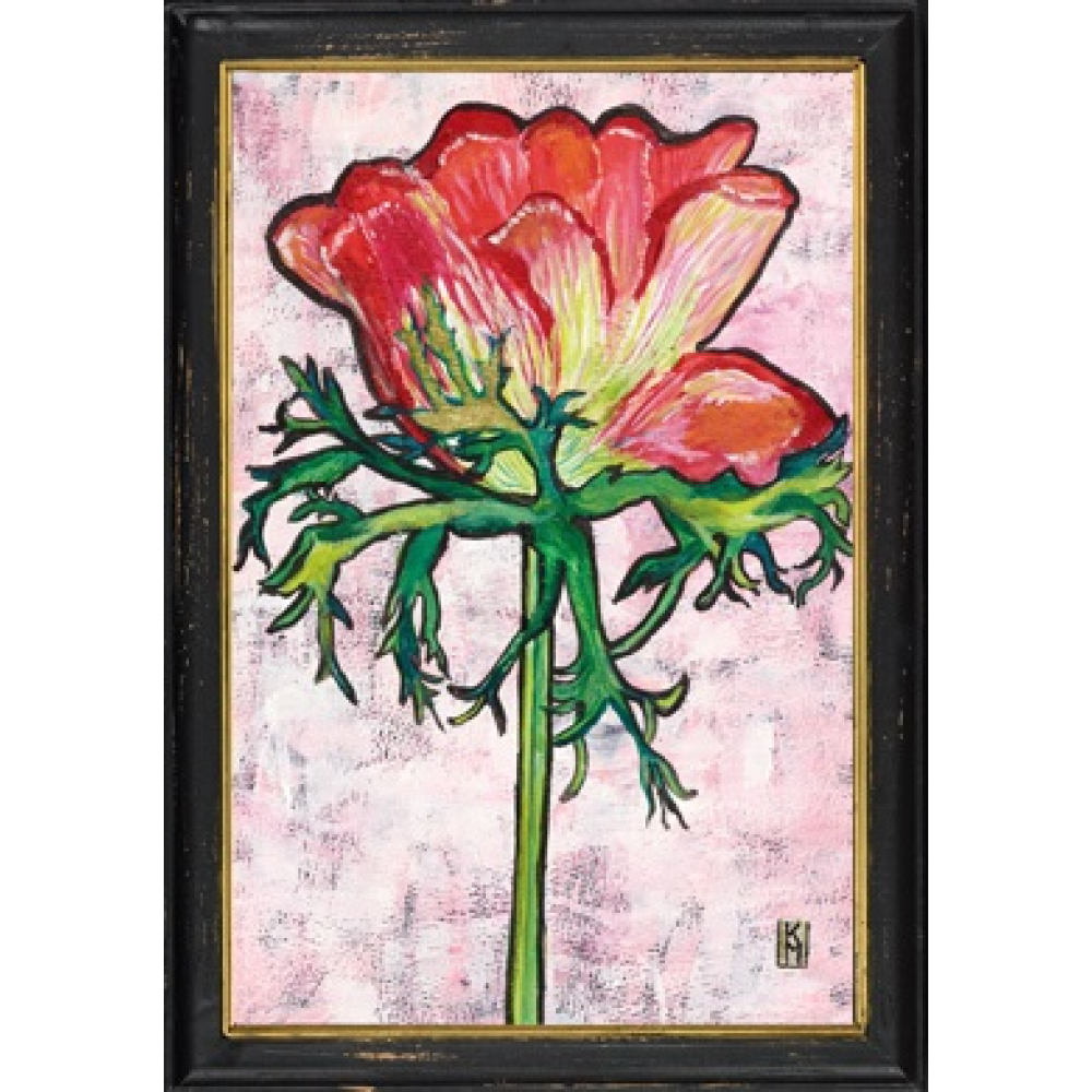 De afbeelding van de rode anemoon is uitgevoerd in een expressieve, gelaagde schilderstijl. De dieprode en felle koraaltinten van de bloem steken prachtig af tegen de zachtroze, textuurrijke achtergrond. De fijn vertakte, groene kelkbladen die de bloem ondersteunen, geven het werk een natuurlijke diepte en een artistieke finesse. Het werk is gevat in een robuuste zwarte houten lijst met een verfijnde gouden binnenrand, die de botanische print een luxe uitstraling geeft. De licht verweerde afwerking van de lijst voegt een authentieke vintage touch toe aan het geheel.